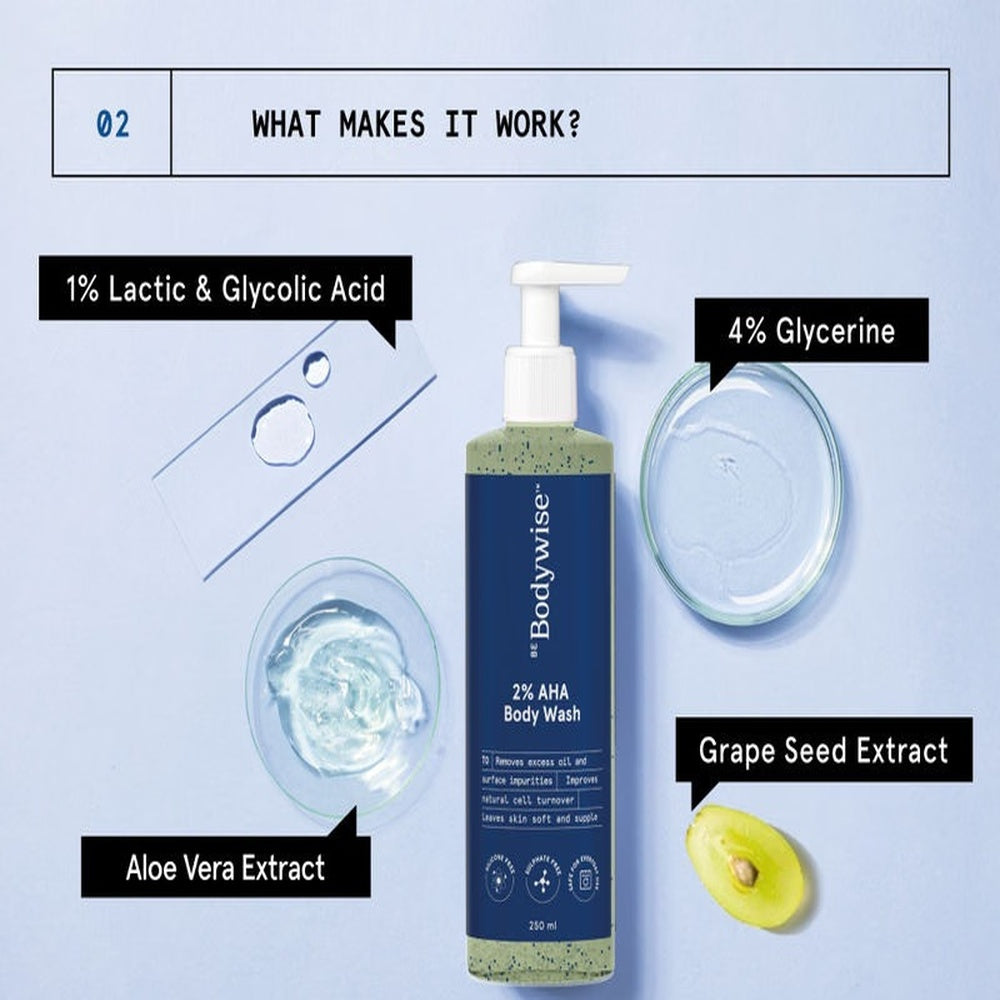 Be Bodywise 2% AHA Body Wash (250ml) offers a gentle exfoliation with 2% alpha hydroxy acids, promoting smoother, refreshed skin. This formula helps remove dead skin cells and supports natural skin renewal, enhancing texture and radiance without irritation. Ideal for daily use, it leaves the skin feeling clean, soft, and revitalized while improving overall skin clarity. Suitable for all skin types seeking a professional-grade exfoliating body wash.