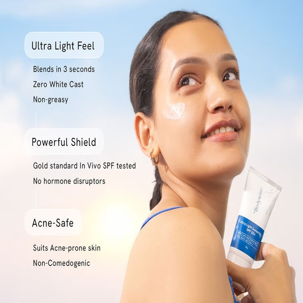 Be Bodywise Ultra Light Sunscreen SPF50+ offers high-level protection against harmful UVA and UVB rays with a lightweight, non-greasy formula. Designed for daily use, it absorbs quickly into the skin, providing a comfortable, breathable shield without clogging pores. Ideal for all skin types, this sunscreen helps prevent sunburn and premature aging while maintaining a matte finish, making it perfect for both outdoor activities and everyday wear.