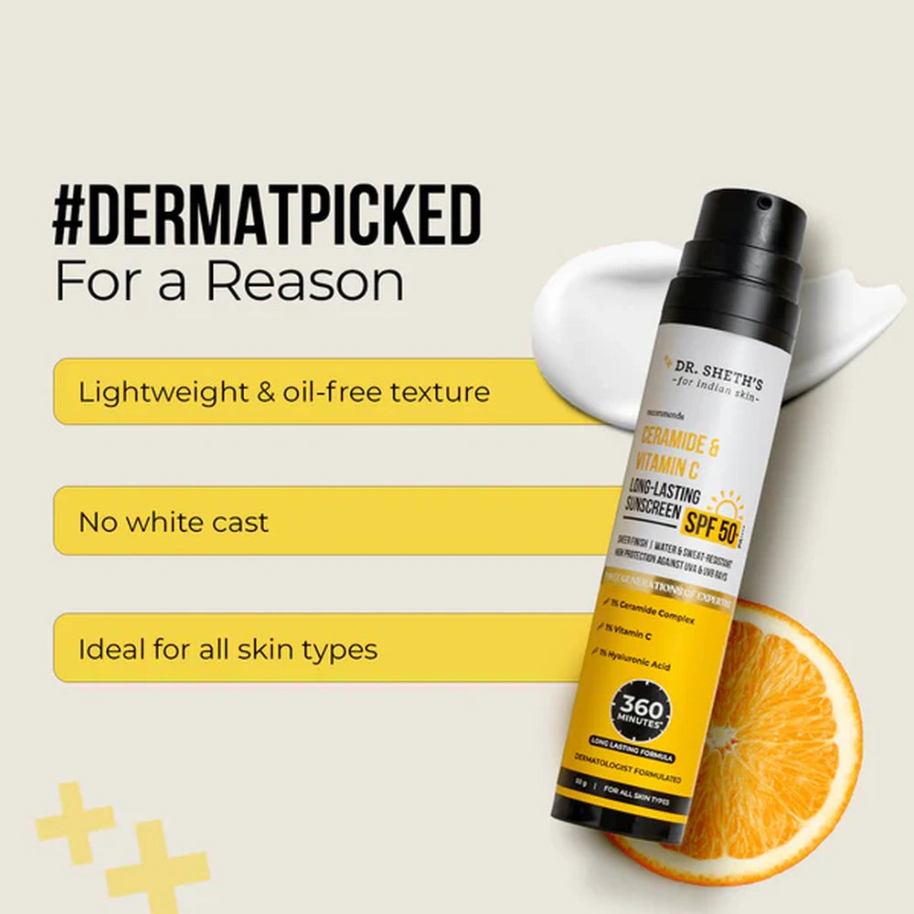 Dr. Sheths Ceramide & Vitamin C Long Lasting Sunscreen (50gm) offers advanced protection with a blend of ceramide and vitamin C to shield your skin from harmful UV rays while promoting a brighter, more resilient complexion. This lightweight formula ensures long-lasting defense against sun damage and helps maintain skin hydration. Ideal for daily use, it supports skin barrier health and helps reduce dullness, providing expert care in every application.