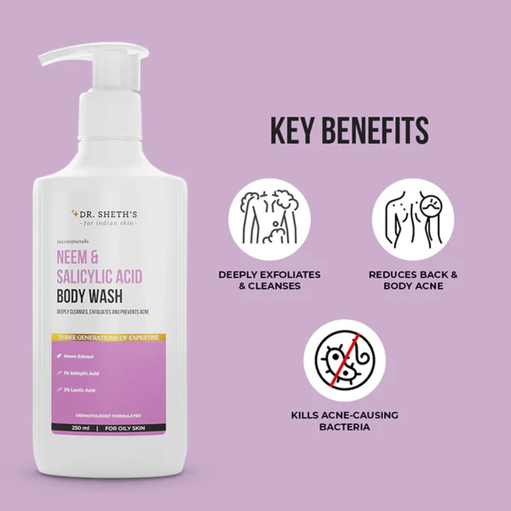 Dr. Sheths Neem & Salicylic Acid Body Wash (250ml) offers a targeted solution for keeping skin clear and healthy. Enriched with neem, known for its antibacterial properties, and salicylic acid, a proven exfoliant, this body wash helps to gently remove impurities and prevent breakouts. Its formulation suits oily and acne-prone skin, promoting a refreshed, balanced feel without over-drying. Ideal for regular use, it supports skin’s natural defense against bacteria and excess oil.