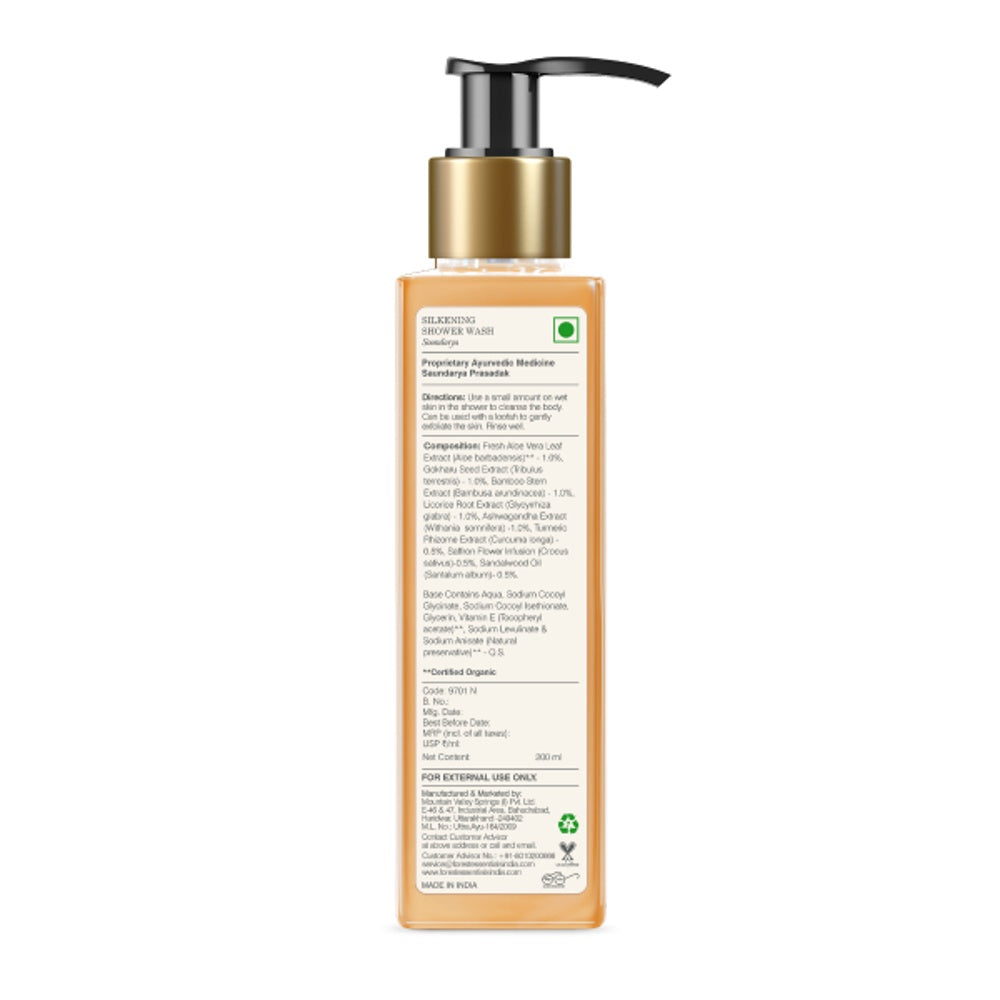 Forest Essentials Silkening Soundarya Shower Wash is a luxurious cleansing formula designed to gently purify your skin while enhancing its natural glow. Enriched with Ayurvedic ingredients, it nourishes deeply, leaving your skin silky smooth and radiant after every shower. Ideal for daily use, this shower wash balances hydration and cleanliness, promoting a healthy, vibrant complexion with every wash.