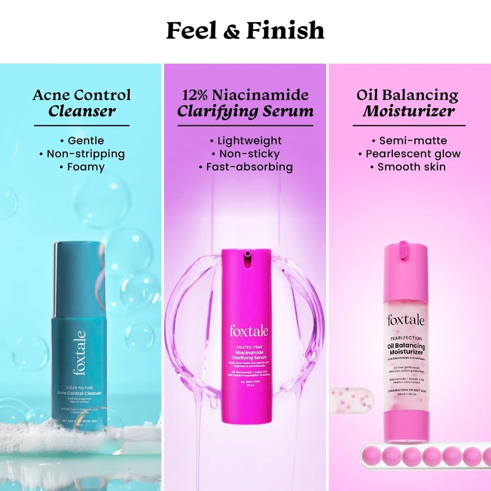 The Foxtale Clear Skin Care Trio combines a powerful acne cleanser, a 12% niacinamide serum, and an oil-balancing moisturizer to target acne, blemishes, and excess oil effectively. Formulated with salicylic acid, azelaic acid, and cica, this 180 ml set works synergistically to unclog pores, calm inflammation, and restore skin balance within 14 days. Ideal for oily and acne-prone skin, it promotes clearer, calmer, and healthier-looking skin through a dermatologist-inspired regimen.