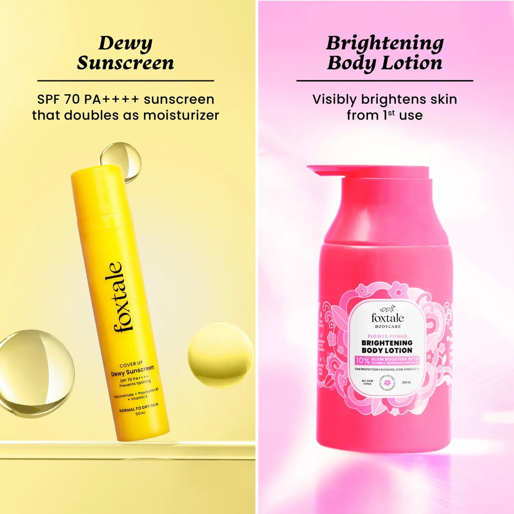 The Foxtale Dewy Defense Kit offers a comprehensive skincare routine with four essential products: sunscreen, moisturizer, face wash, and body lotion. This curated combo is designed to protect, hydrate, cleanse, and nourish your skin, supporting a balanced and healthy complexion. Ideal for daily use, each product works synergistically to defend against environmental stressors while maintaining skin’s natural moisture and clarity. Elevate your skincare regimen with this expertly formulated all-in-one kit.
