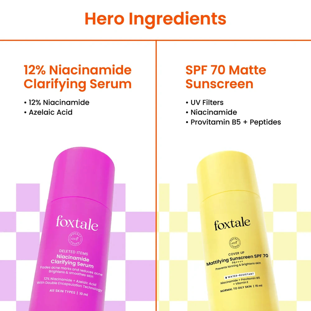 Foxtale Glow Up Minis Combo offers a targeted skincare duo designed for oily, acne-prone skin. The 12% Niacinamide Serum helps fade acne marks and regulate oil production, while the SPF 70 Matte Sunscreen provides high-level UV protection with a non-greasy, matte finish. Compact and travel-friendly, this combo supports clearer skin and effective sun defense wherever you go.