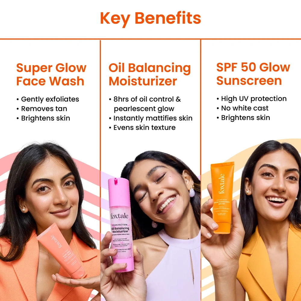 The FoxTale Instant Glow Routine Kit combines a 100 ml Super Glow Face Wash, a 50 ml Oil Balancing Moisturizer, and a 30 ml SPF 50 Glow Sunscreen to deliver a comprehensive skincare regimen. This trio works synergistically to cleanse, hydrate, and protect your skin, promoting a radiant and balanced complexion while shielding against harmful UV rays. Ideal for maintaining healthy, glowing skin every day.