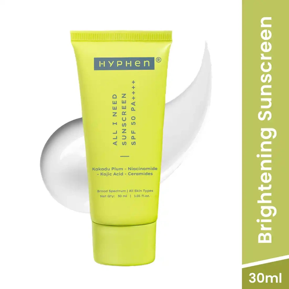 Hyphen All I Need Sunscreen SPF50 PA++++ offers broad-spectrum protection against UVA and UVB rays with a high SPF rating. Enriched with brightening ingredients like niacinamide, kojic acid, and vitamin C-rich Kakadu plum, it helps improve skin tone and reduce dullness. This lightweight, non-greasy formula absorbs quickly, making it ideal for daily use under makeup or alone. Protect and brighten your skin effortlessly with this expert-formulated sunscreen.