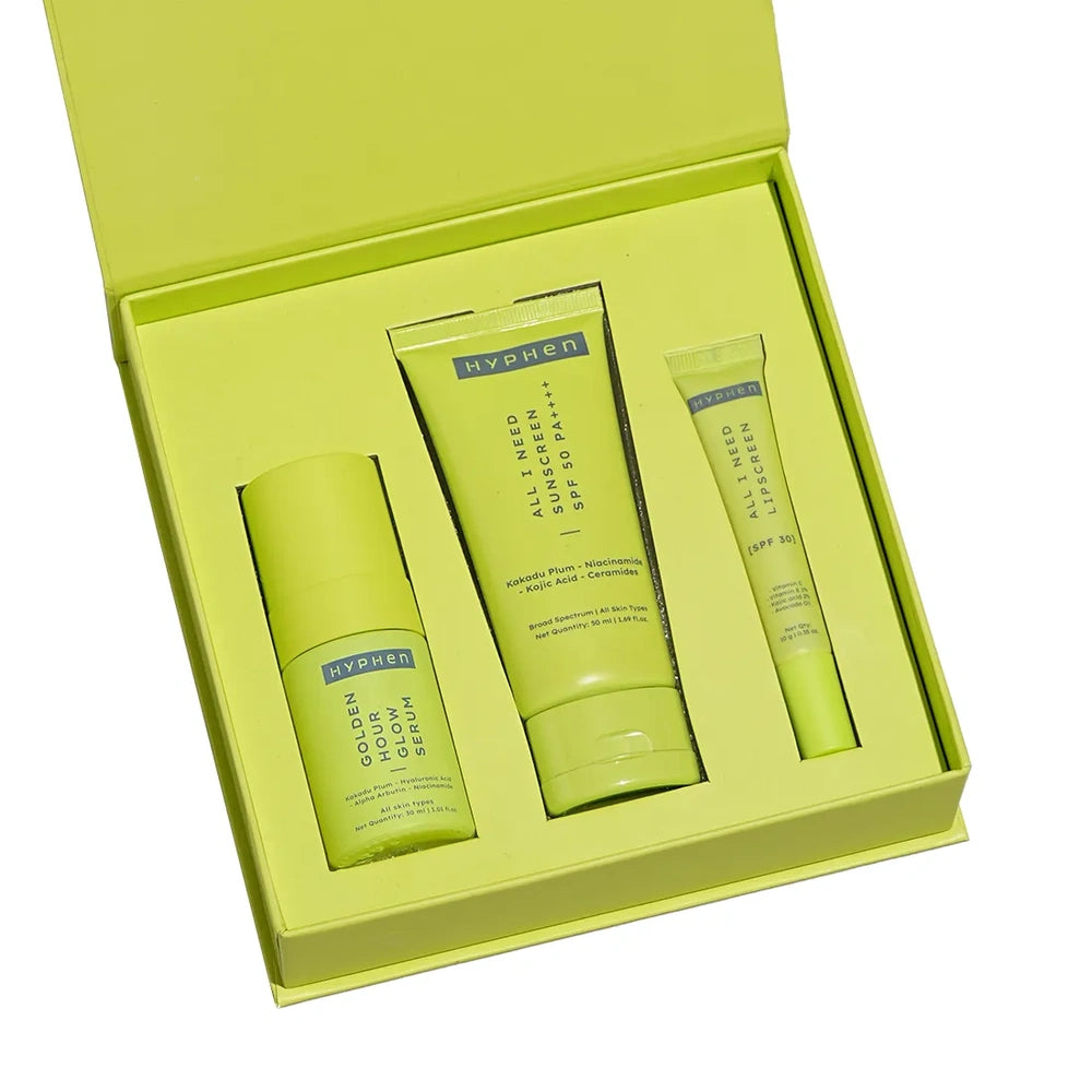 Elevate your skincare routine with the Hyphen Daily Glow Essentials Gift Kit. This expertly curated combo includes key products designed to nourish and revitalize your skin daily. Each item works synergistically to promote a radiant, healthy glow while maintaining balance and hydration. Perfect for those seeking a reliable and effective regimen, this kit offers the essential foundation for glowing skin with consistent use.