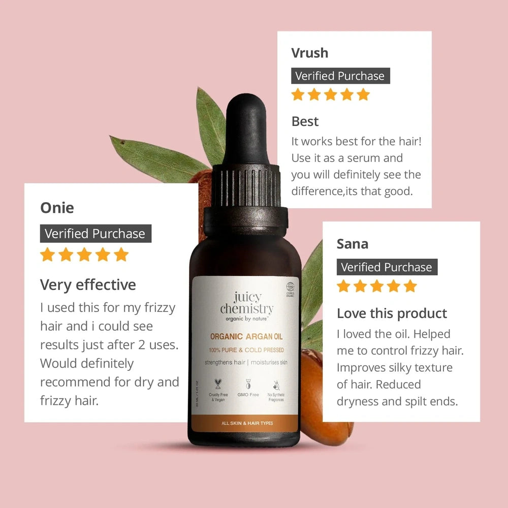 Juicy Chemistry Cold Pressed Argan Carrier Oil is a pure, nutrient-rich oil extracted through a gentle cold-pressing process to preserve its natural benefits. Known for its high content of vitamin E and essential fatty acids, this carrier oil supports skin hydration, promotes elasticity, and helps soothe dry or irritated skin. Ideal for dilution of essential oils or direct application, it nourishes without clogging pores, making it suitable for all skin types and expert skincare formulations.