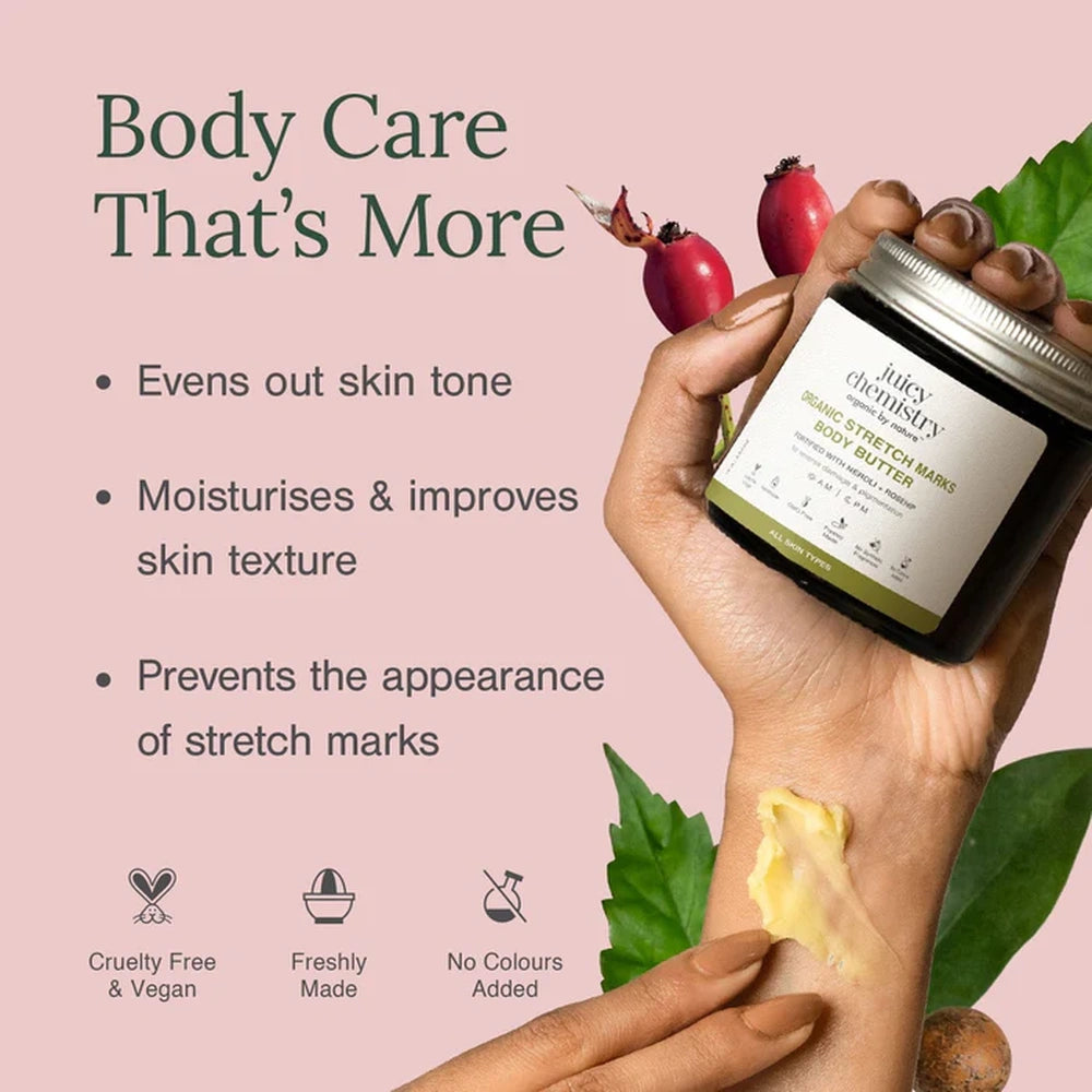 Juicy Chemistry Neroli Rosehip and Tamanu Body Butter (75g) is a rich, natural moisturizer designed to deeply nourish and hydrate the skin. Formulated with neroli essential oil, rosehip, and tamanu, this body butter supports skin regeneration, improves elasticity, and soothes dryness. Its carefully balanced blend of botanicals helps maintain a healthy skin barrier, making it ideal for sensitive and dry skin types. This 75g body butter absorbs smoothly without leaving a greasy residue, promoting a soft, radiant complexion with consistent use.