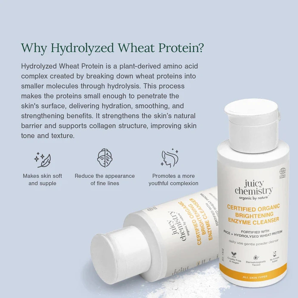 Juicy Chemistry Organic Brightening Enzyme Cleanser (50g) gently exfoliates and cleanses the skin using natural enzyme technology. This organic formula helps remove impurities and dead skin cells, promoting a brighter, more radiant complexion. Suitable for daily use, it supports skin renewal without irritation, making it ideal for those seeking a natural approach to clear, glowing skin.