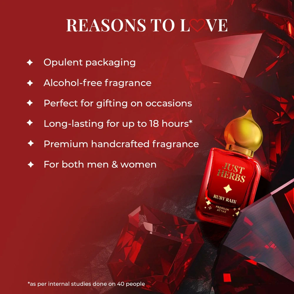Just Herbs Ruby Rain Premium Attar (10ml) offers a luxurious, natural fragrance blend crafted with pure essential oils. Its well-balanced scent combines floral and woody notes, providing a long-lasting aromatic experience. This attar is alcohol-free, making it gentle on the skin and suitable for daily wear. Ideal for those seeking an elegant and authentic natural perfume, it enhances mood and presence with subtle sophistication.