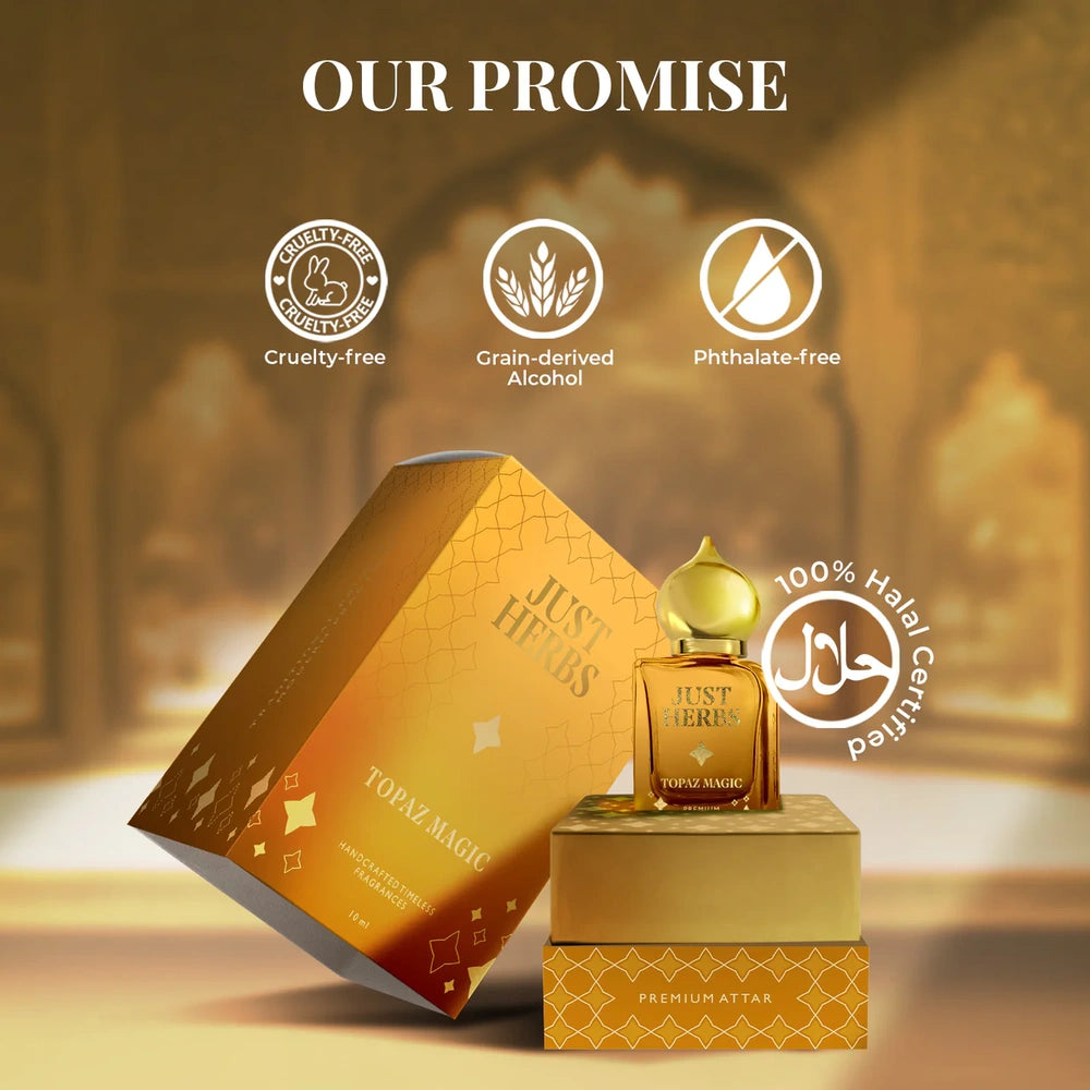 Just Herbs Topaz Magic Premium Attar (10ml) is a refined blend of natural essential oils designed to deliver a rich, aromatic experience. This alcohol-free attar combines spicy and warm notes that create a captivating and enduring fragrance. Crafted for those who appreciate subtle yet distinct scents, it offers a skin-friendly option that enhances personal aura while maintaining purity and elegance. Perfect for everyday use or special occasions.