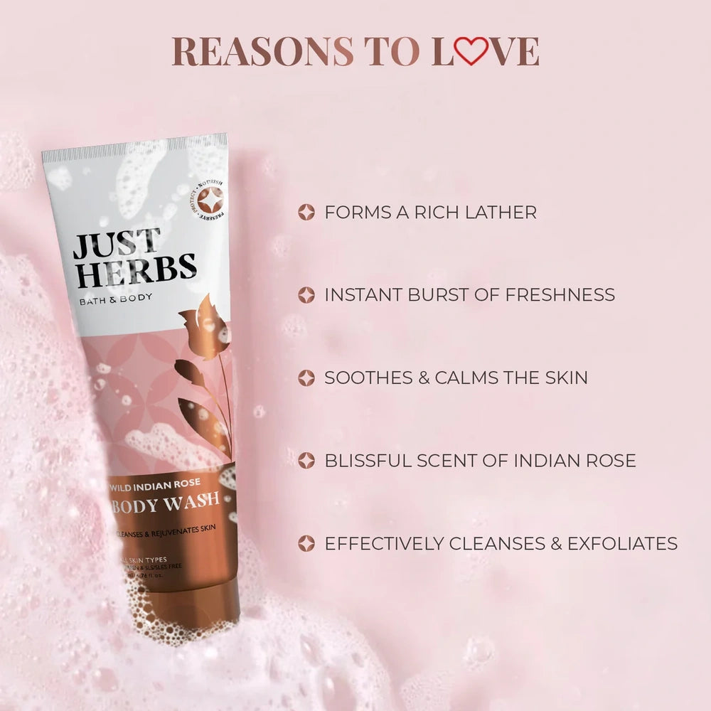 Just Herbs Wild Indian Rose Body Wash gently cleanses while nourishing the skin with natural ingredients. Enriched with wild rose extracts, it helps maintain hydration and imparts a subtle, refreshing floral scent. This 200ml formula is designed to soothe and revitalize, making it suitable for daily use on all skin types. Its carefully curated botanicals enhance skin softness and promote a balanced complexion.