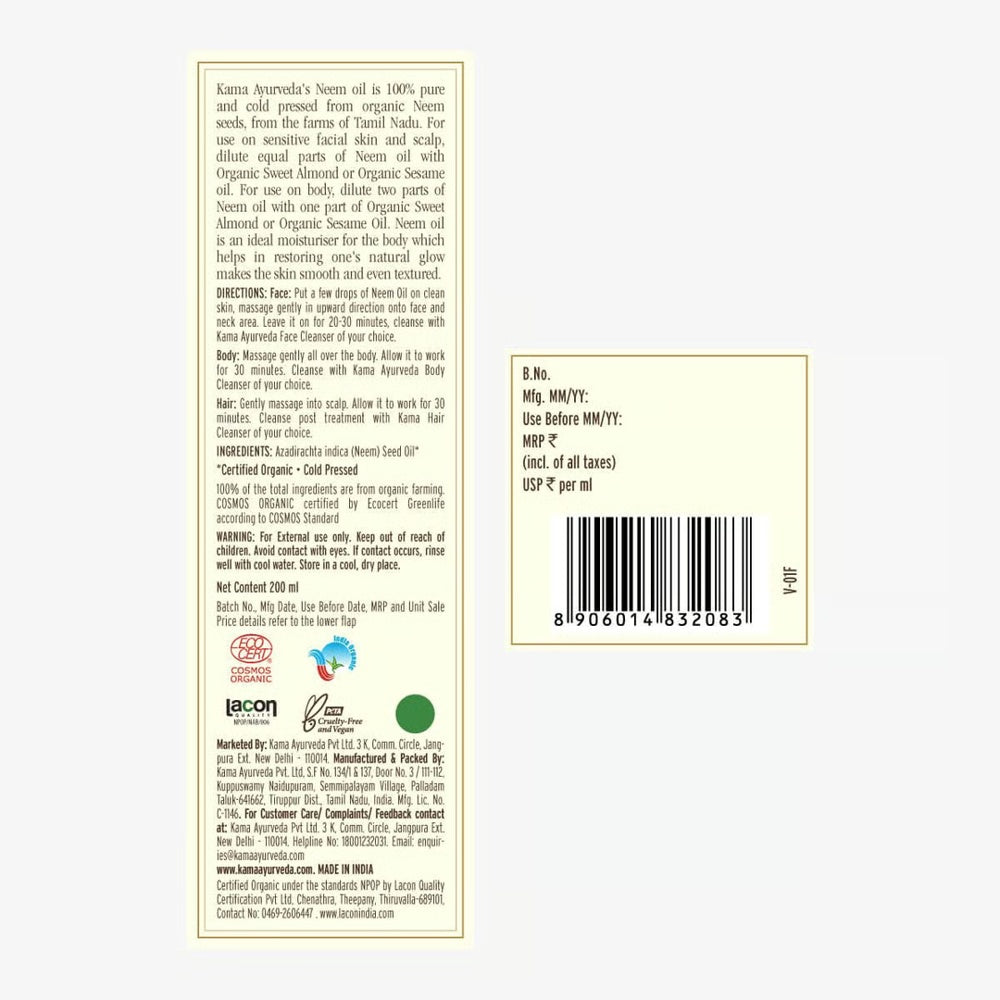 Kama Ayurveda Organic Neem Hair Oil is expertly formulated with cold-pressed neem, known for its potent antibacterial and antifungal benefits. It helps maintain a healthy scalp by reducing dandruff, soothing irritation, and strengthening hair roots. Regular use promotes hair growth, combats dryness, and supports overall scalp wellness, making it an effective natural solution for healthier, nourished hair.