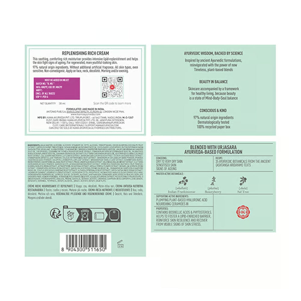 Kama Ayurveda Urjasara Nourish & Replenishing Rich Cream is a deeply hydrating formula designed to revitalize dry and sensitive skin. Enriched with natural Ayurvedic ingredients, it replenishes moisture while restoring skin’s natural balance, leaving it soft, supple, and radiant. Ideal for daily use, this rich cream supports skin health by soothing irritation and providing long-lasting nourishment.