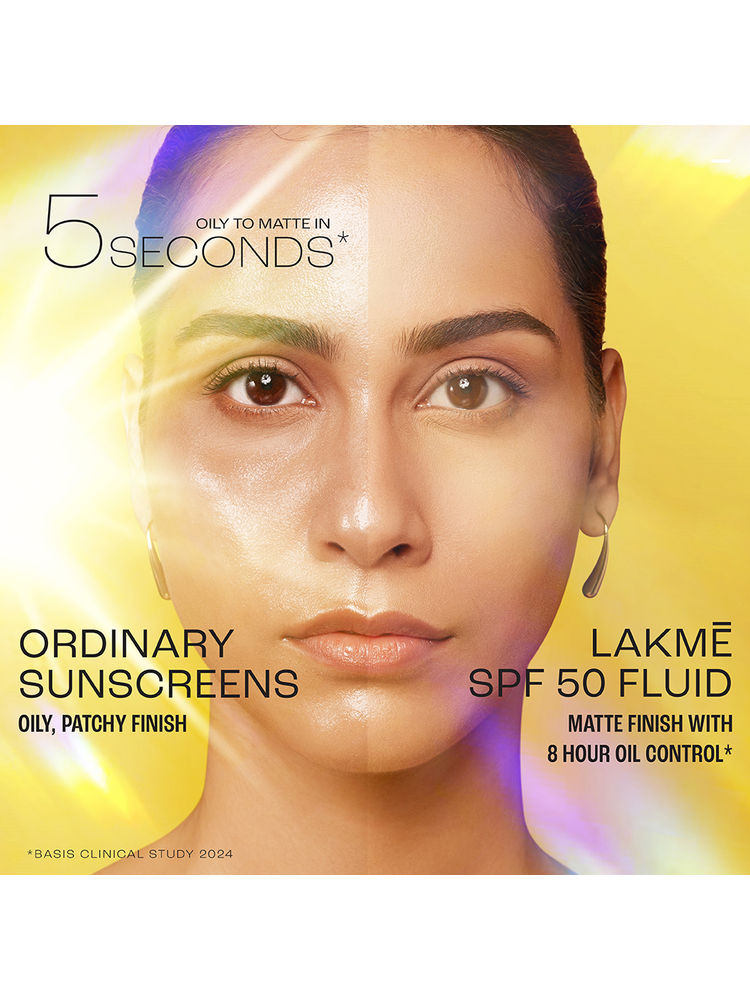 Shield your skin from harsh UV rays with Lakme Sun Expert Dry Matte Fluid SPF 50 PA++++ — a lightweight, fast-absorbing sunscreen powered with 1% Niacinamide and Ceramides. This daily-use fluid sunscreen offers broad-spectrum protection while improving skin texture and hydration, leaving your skin soft, smooth, and shine-free.