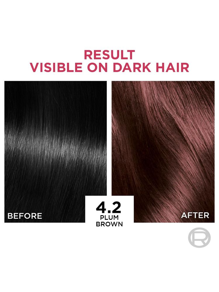 L'Oreal Paris Excellence Creme Hair Color in 4.2 Plum Brown offers triple care protection for deep, rich color and 100% grey coverage. The advanced formula with Pro-Keratin, Ceramide, and Collagen ensures nourished, shiny, and protected hair post-coloring.