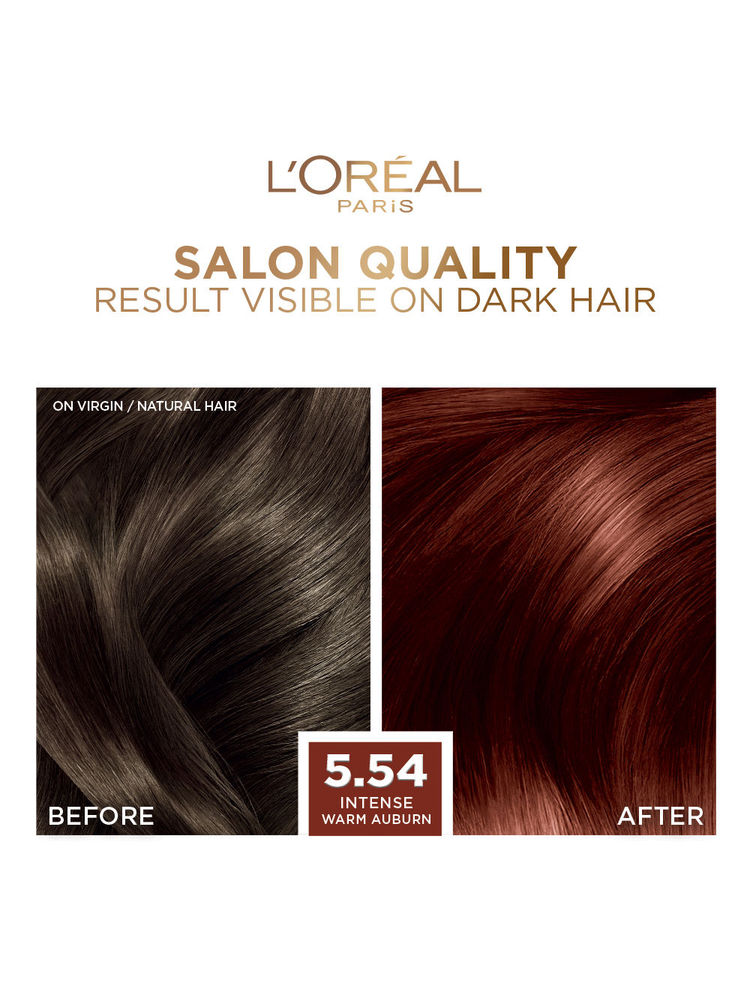 L'Oreal Paris Excellence Fashion Hair Color in 5.54 Intense Warm Auburn offers vibrant, long-lasting color with salon-like shine. The formula is enriched with Hi-Shine Complex and includes a post-color conditioner for radiant, nourished hair.