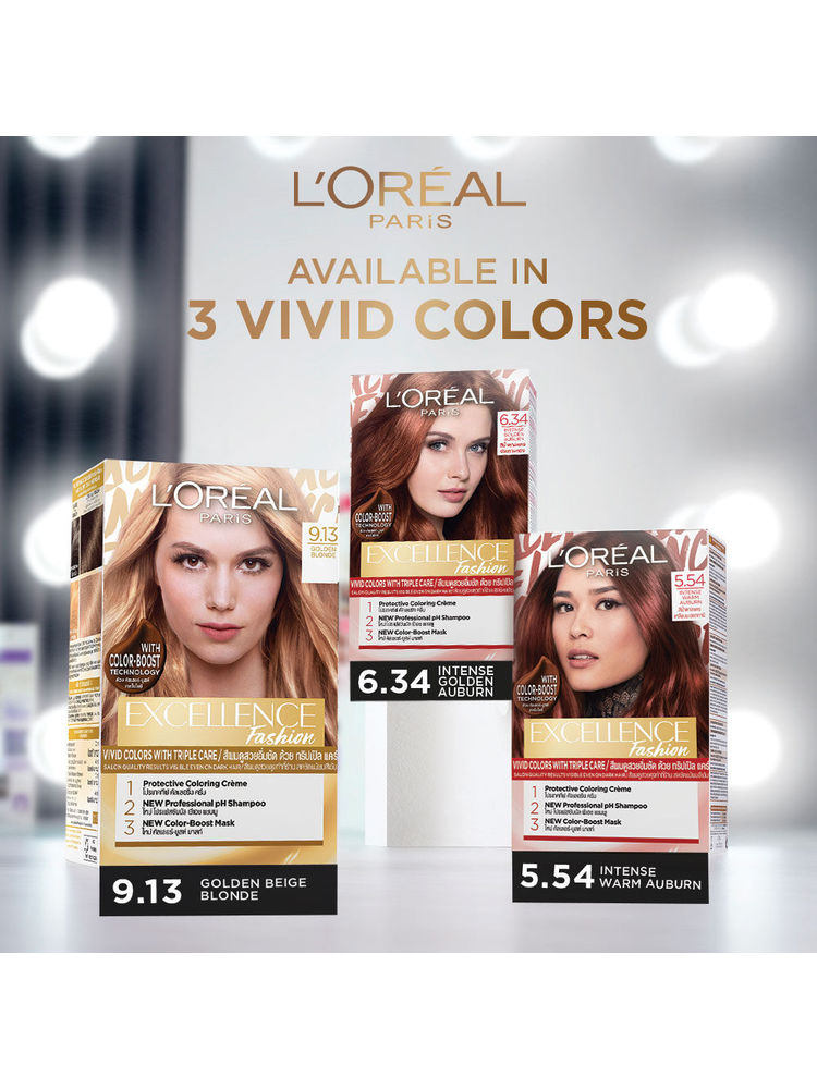 L'Oreal Paris Excellence Fashion Hair Color in 9.13 Golden Beige Blonde provides salon-quality results at home. This formula delivers rich blonde tones with radiant shine and 100% grey coverage.