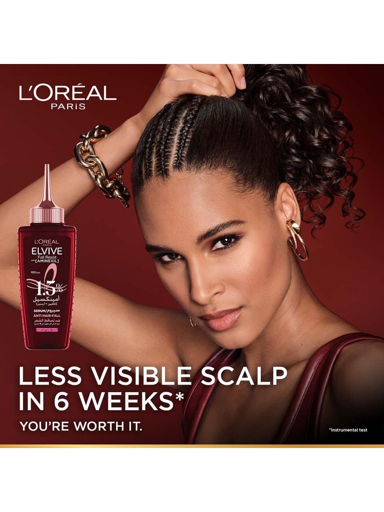L'Oreal Paris Fall Resist Anti Hair Fall Serum is a clinically backed solution designed to strengthen fragile hair from the roots. Infused with 1.5% Aminexil, caffeine, and arginine, this serum works to reduce hair fall, improve scalp health, and reinforce each strand for long-lasting protection. It’s perfect for daily use, offering a lightweight texture and fast absorption without any greasy residue.