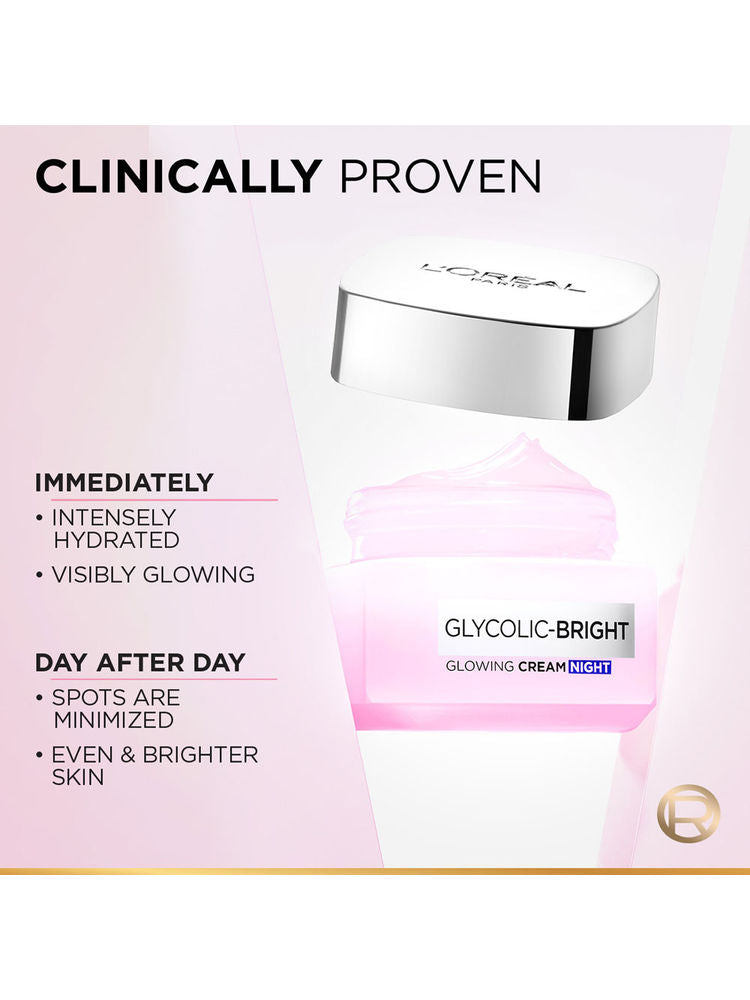 L'Oreal Paris Glycolic Bright Night Cream is formulated with Glycolic Acid and Niacinamide to visibly reduce dark spots and brighten skin overnight. It helps improve skin texture and tone while you sleep, leaving your skin smooth and radiant.