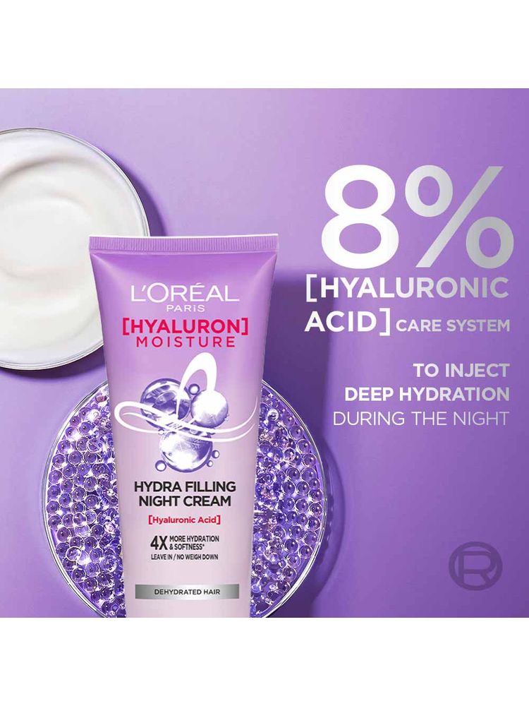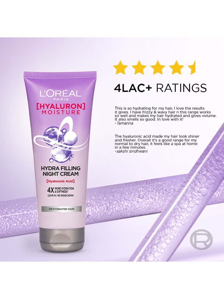 L'Oreal Paris Hyaluron Moisture Leave-In Night Cream is a deeply hydrating overnight treatment for dry, frizzy hair. Powered by hyaluronic acid, this leave-in cream penetrates the hair shaft to restore lost moisture while you sleep. Wake up to soft, frizz-free, and manageable hair every morning—no rinse needed.