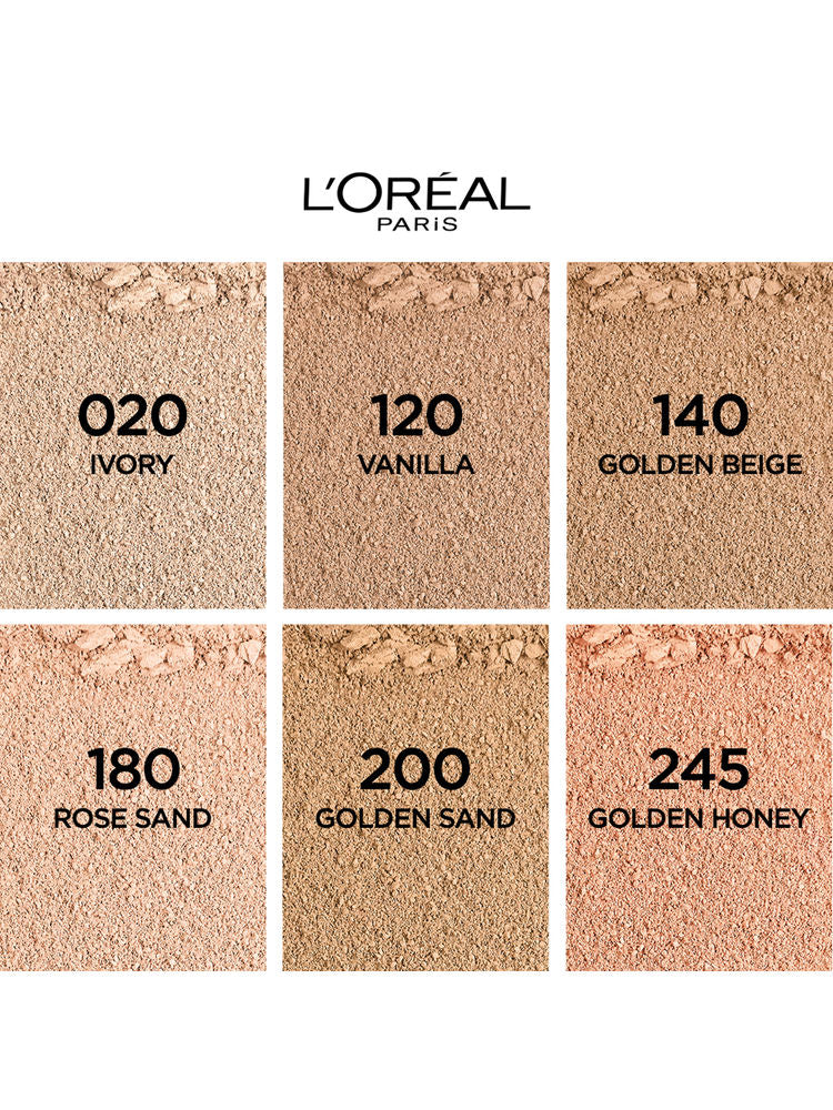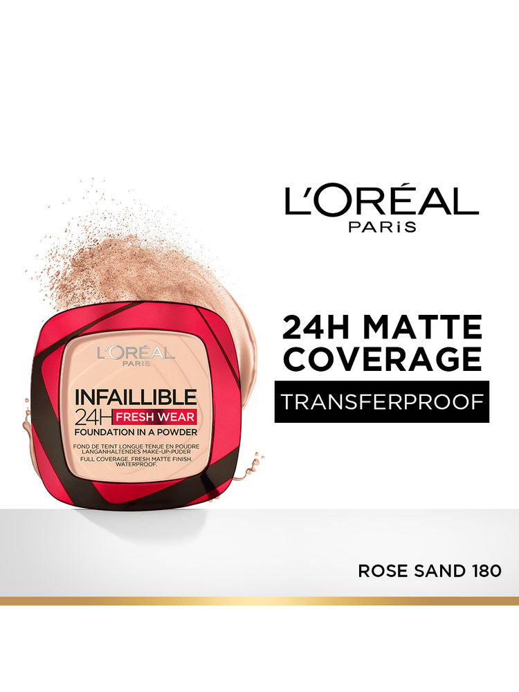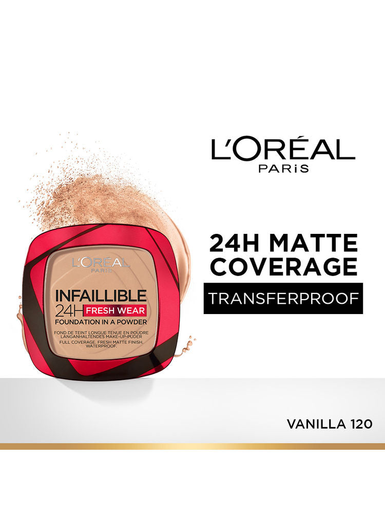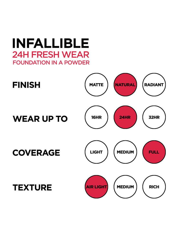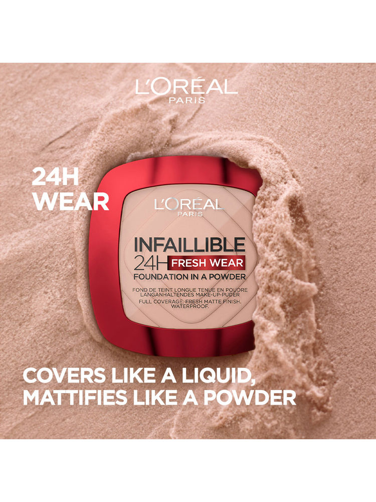 Achieve a flawless matte finish with the L'Oreal Paris Infallible Fresh Wear Powder Foundation. This innovative powder offers the coverage of a liquid foundation with the lightweight feel of a powder. Formulated to resist sweat, heat, and humidity, it delivers up to 24 hours of comfortable wear. It blurs imperfections, evens out skin tone, and controls shine—without drying out your skin. Ideal for on-the-go touch-ups or full-face application, it's your perfect companion for a long-lasting, airbrushed look.