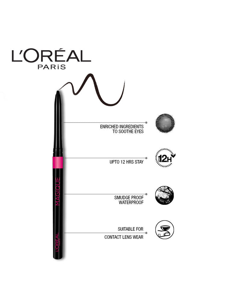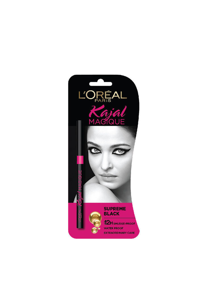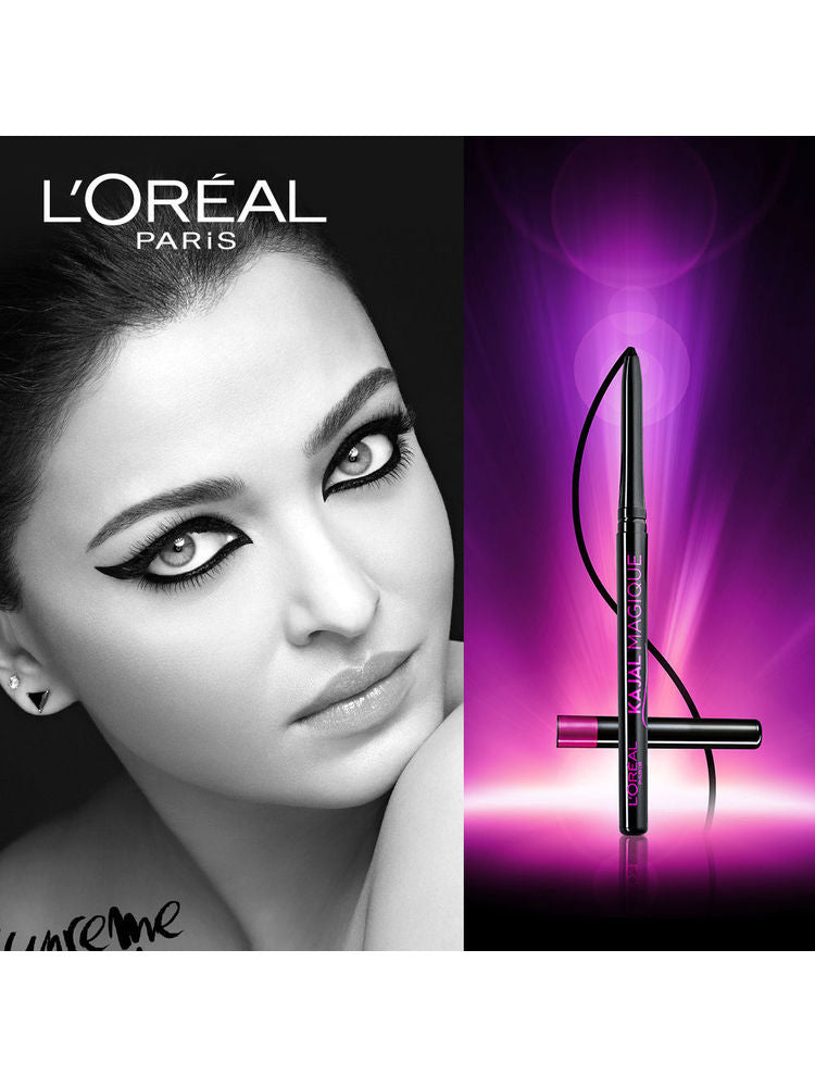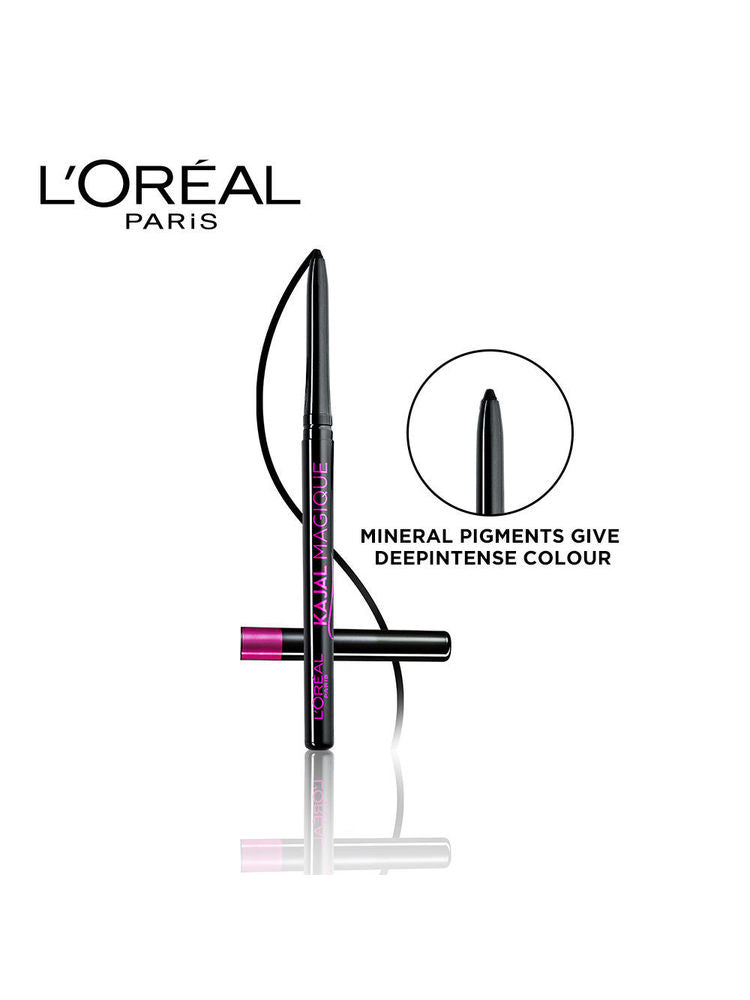 L'Oreal Paris Kajal Magique - Supreme Black delivers deep black pigmentation in a single stroke. Infused with Vitamin E, Cocoa Butter, and Olive Oil Esters, it not only defines your eyes but also nourishes them with care.