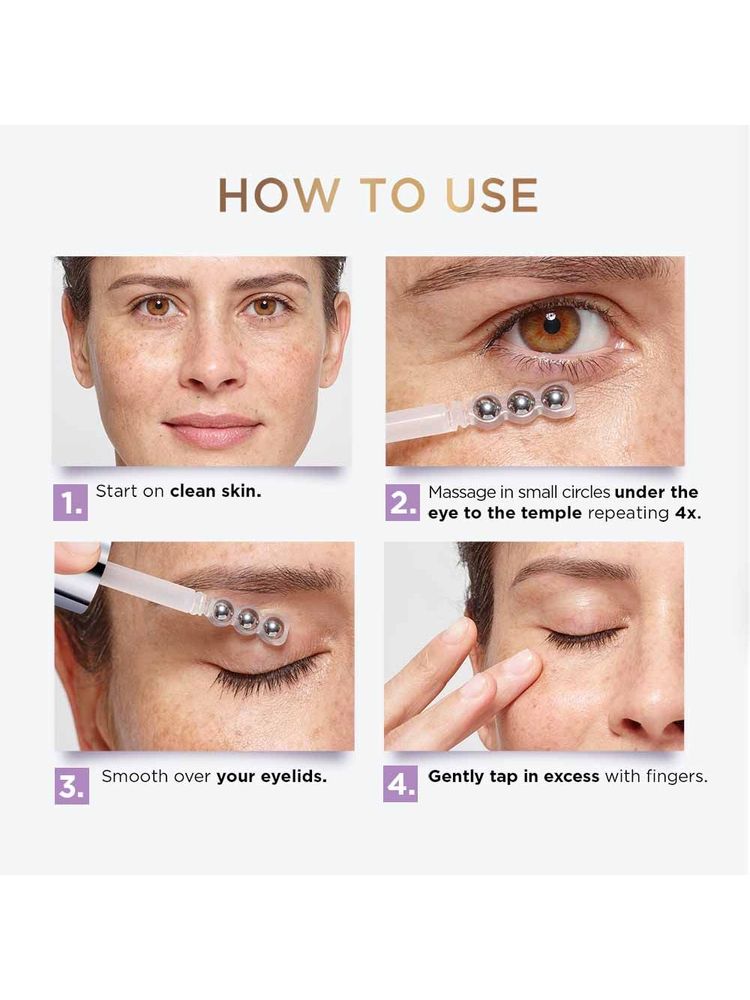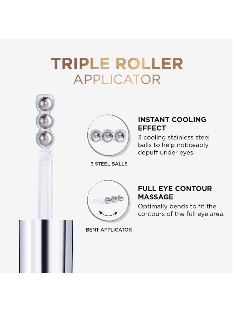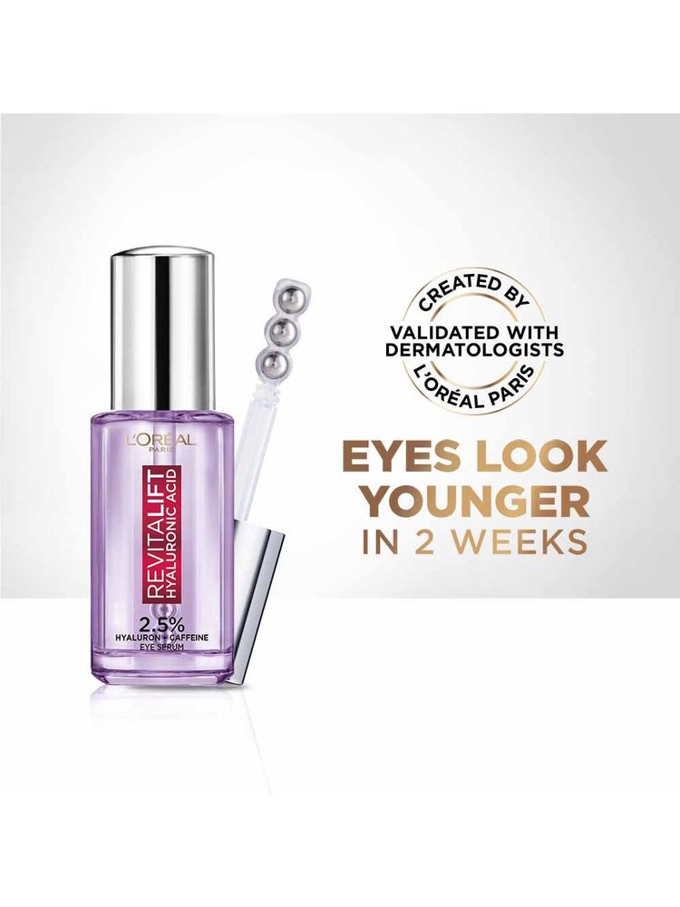 Give your under-eyes the hydration they deserve with L'Oreal Paris Revitalift Eye Serum. Powered by 2.5% Hyaluronic Acid and Caffeine, this dermatologist-tested serum reduces dark circles, puffiness, and fine lines for a refreshed, awake look. Its triple roller metal applicator offers a cooling massage that boosts microcirculation and helps depuff the eye area. The fast-absorbing, non-sticky formula deeply hydrates while visibly firming and brightening the delicate skin around the eyes. Perfect for daily use, morning and night, this serum works well under makeup and suits all skin types.