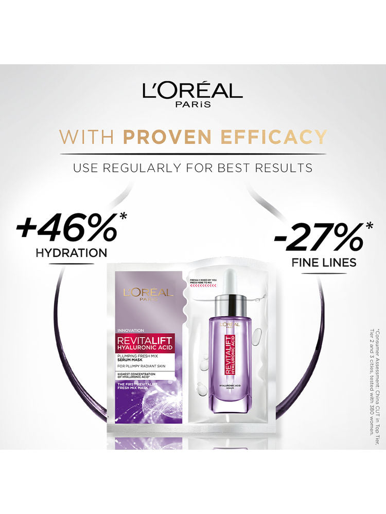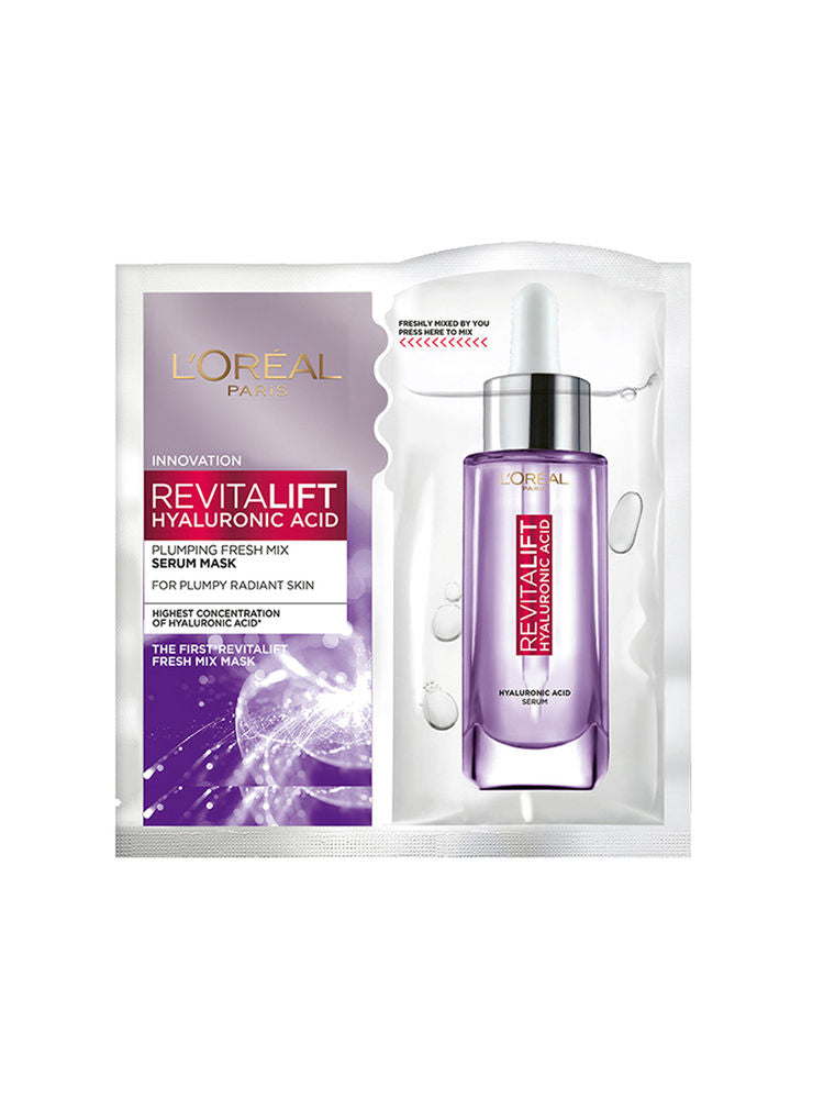L'Oreal Paris Revitalift Hyaluronic Acid Fresh Mix Serum Sheet Mask delivers intense hydration in one use. Just fold and mix the fresh hyaluronic serum into the mask before applying to deeply moisturize and plump up dry, tired skin.