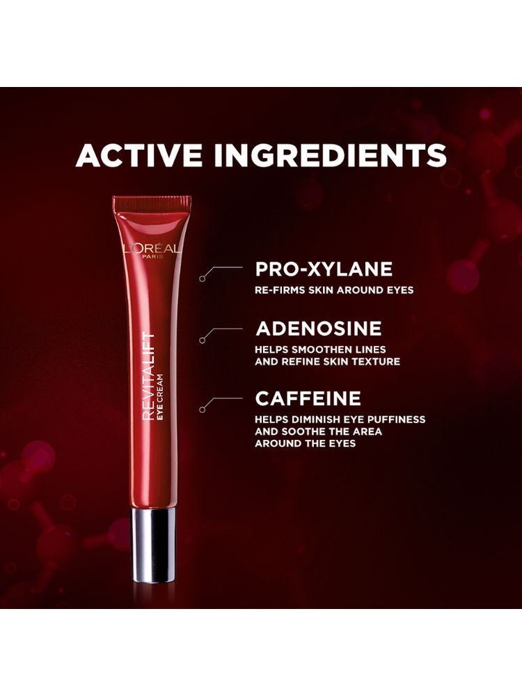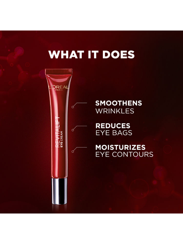 L'Oreal Paris Revitalift Triple Action Eye Cream is designed to visibly reduce wrinkles, depuff under-eye bags, and firm the delicate skin around your eyes. Powered with Pro-Retinol and Caffeine, it targets signs of fatigue and aging effectively.