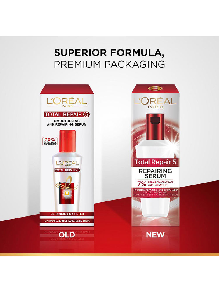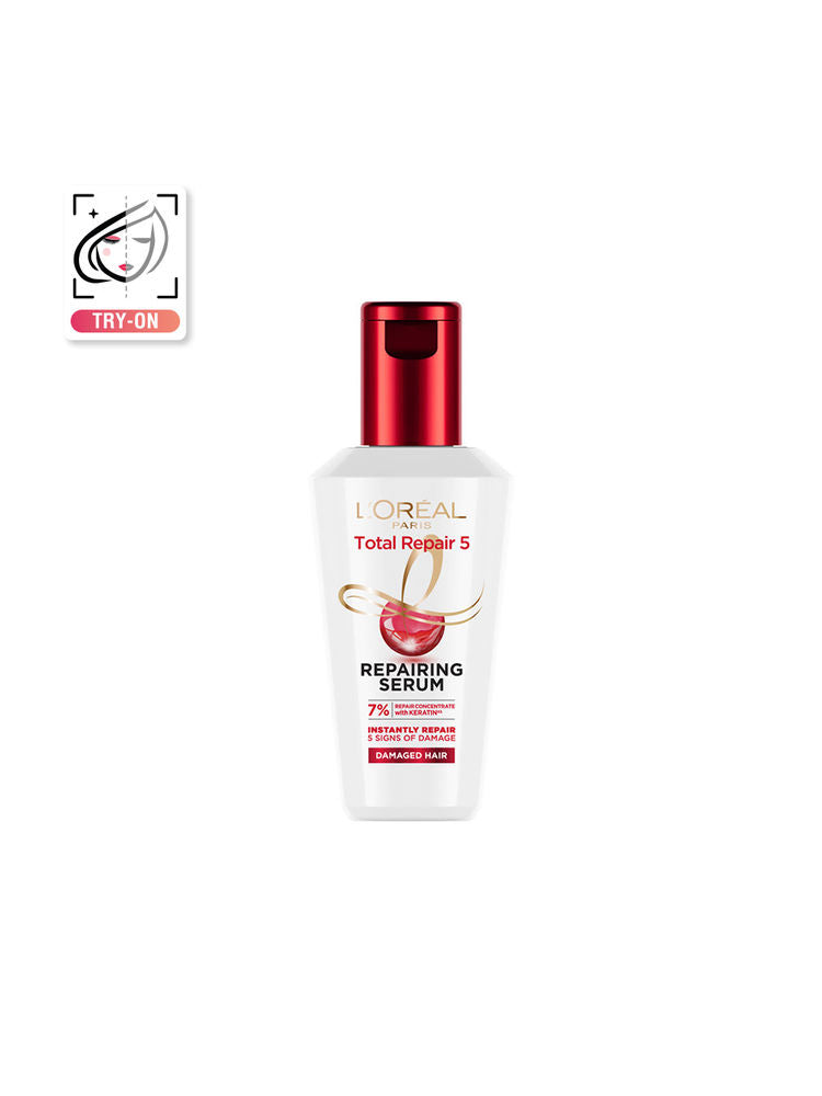 L'Oreal Paris Total Repair 5 Serum is a leave-in treatment designed to repair and protect damaged hair. Infused with Keratin XS, it smoothens hair instantly, controls frizz, and reduces split ends for stronger, healthier-looking hair.