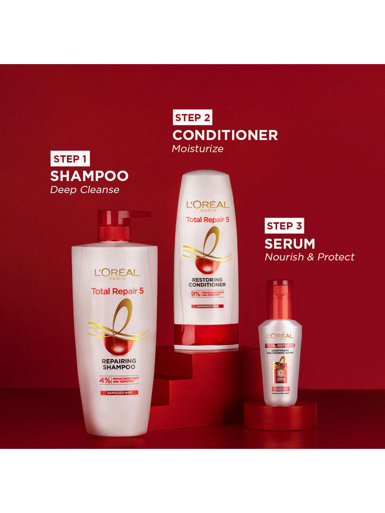 L'Oréal Paris Total Repair 5 Combo includes shampoo, conditioner, and serum to comprehensively target 5 signs of hair damage. Infused with Keratin XS and ceramides, this set restores strength, smoothness, and shine to weak and lifeless hair.