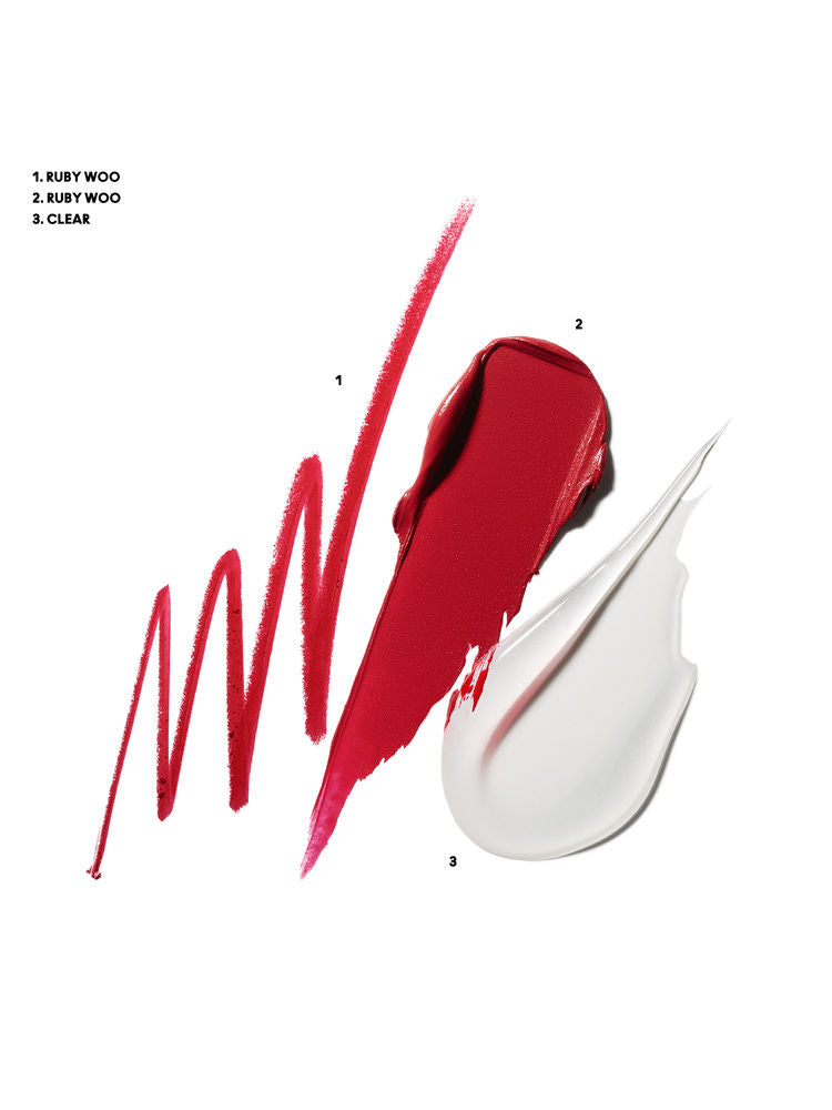 Own the classic red with the M.A.C Ruby Woo Lip Trio. Featuring a lipstick, lipglass, and lip pencil in the iconic cool-toned red, this coordinated set delivers bold color, shine, and definition for any occasion.