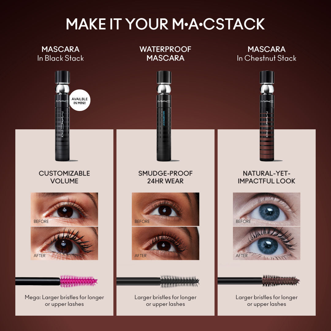 Build your lashes endlessly with M.A.C MacStack Mascara. Its clump-resistant formula and custom brush allow you to layer volume and length as desired. Whether you're going for soft definition or bold drama, this mascara delivers personalized lash perfection with zero compromise. A revolutionary mascara that stacks up to your boldest lash goals.