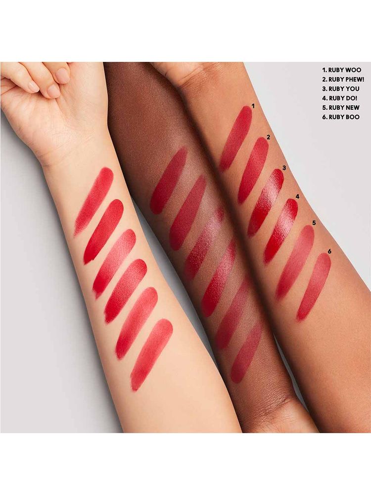 Experience the iconic Ruby Woo in a new avatar with Ruby Phew! from the Ruby’s Crew collection. This liquid lipstick delivers ultra-rich pigment and a velvety retro matte finish that stays put for hours. Smudge-proof, weightless, and unforgettable—this is bold red redefined. Classic red lips meet modern comfort in this high-performance formula.