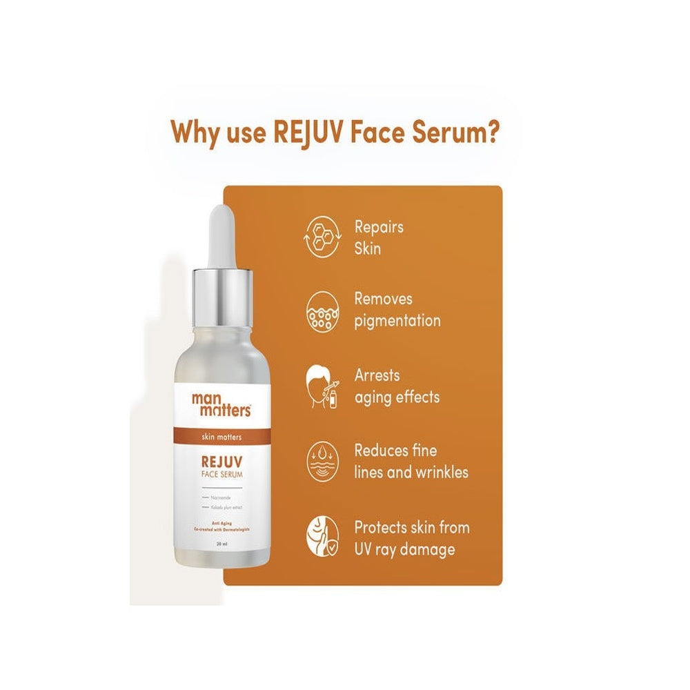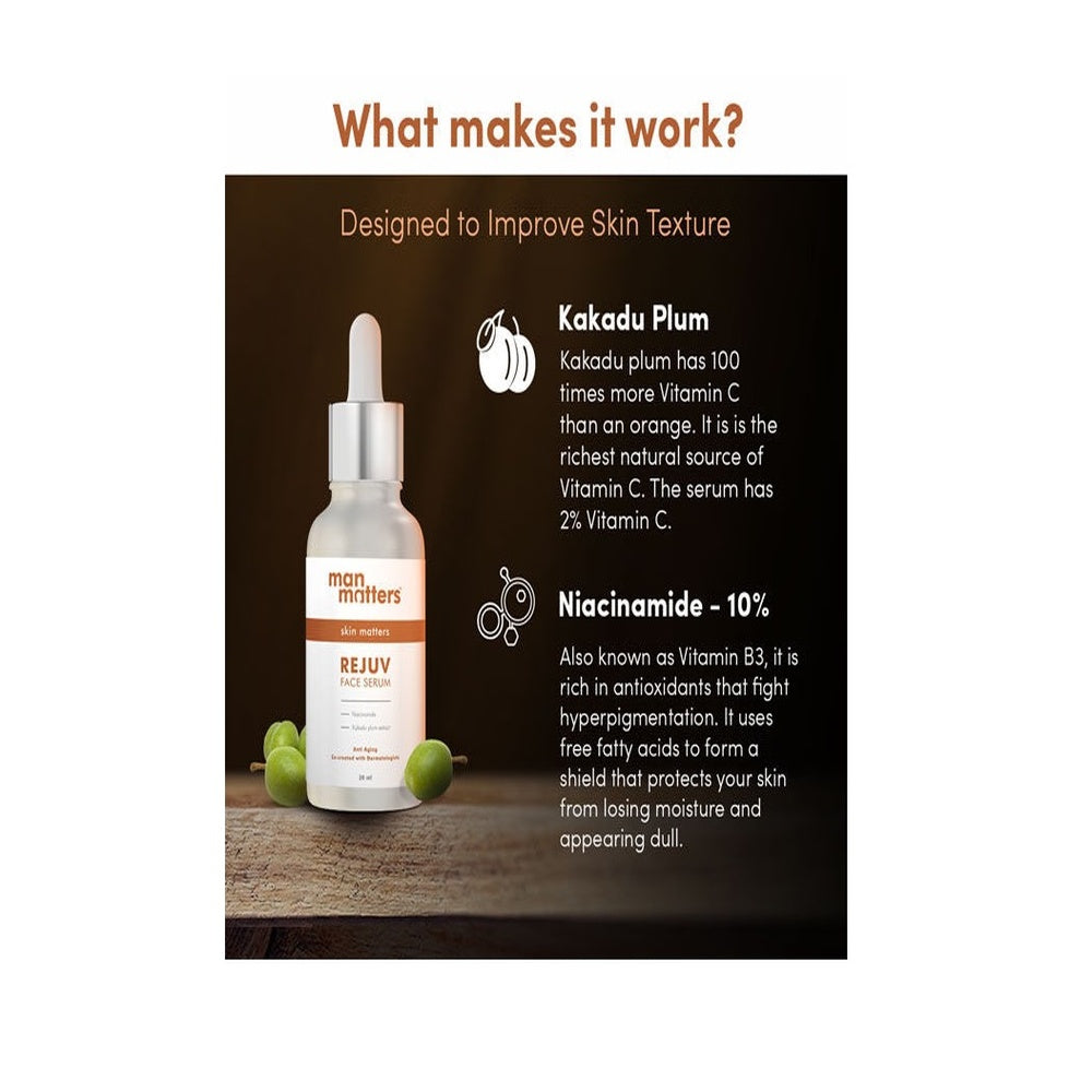 Man Matters REJUV Niacinamide Serum (30ml) is formulated to refine skin texture and improve overall complexion. This expert-grade serum helps regulate oil production, minimize pores, and reduce uneven skin tone, making it ideal for maintaining a balanced and clear appearance. Suitable for daily use, it supports skin’s natural barrier and promotes a smoother, healthier look over time.