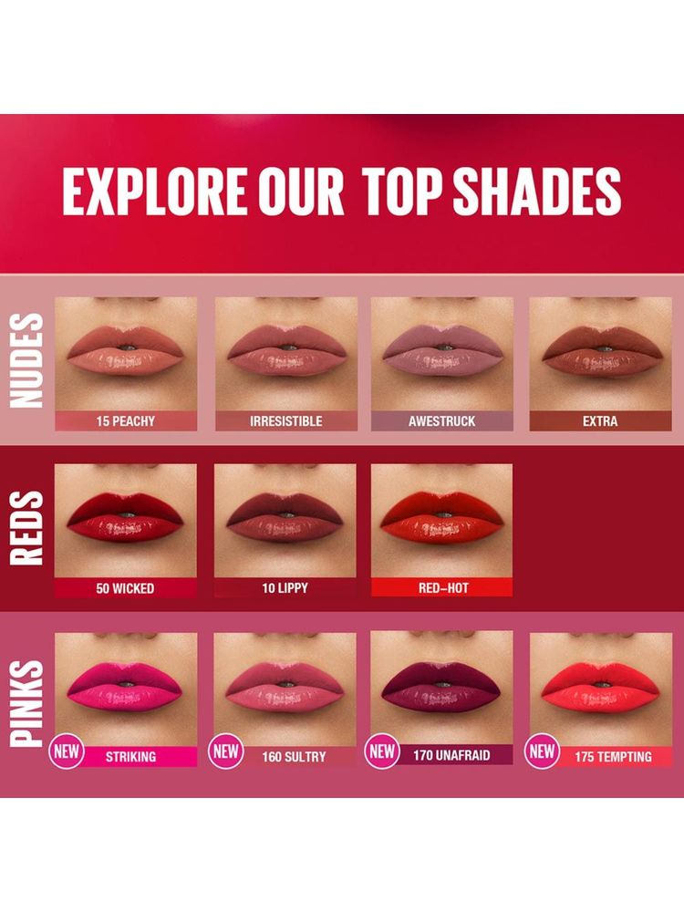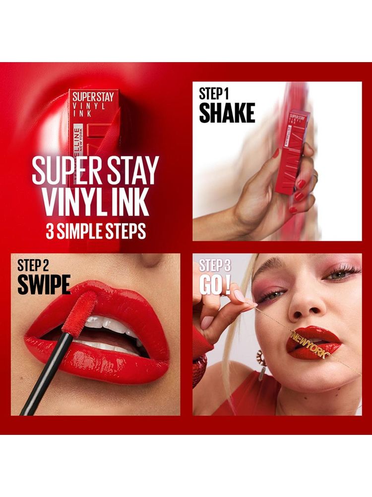 Maybelline New York Super Stay Vinyl Ink Liquid Lipstick, Instant Shine Lasts Up To 16H - 10 Lippy(4.2ML) To apply this longwear lipstick—simply shake, swipe and go. For the perfect vinyl lip, first shake up Maybelline Vinyl Ink Lipstick for at least 5 seconds before applying. Next apply to your lips using its precise flocked tip applicator. Lastly, let it dry and go! #shakeswipego delivers intense pigment with a striking vinyl shine that lasts up to 16 hours. Designed for bold beauty lovers, this liquid lipstick stays put without smudging or fading throughout the day. The lightweight, no-budge formula keeps lips hydrated and vibrant from morning to night.