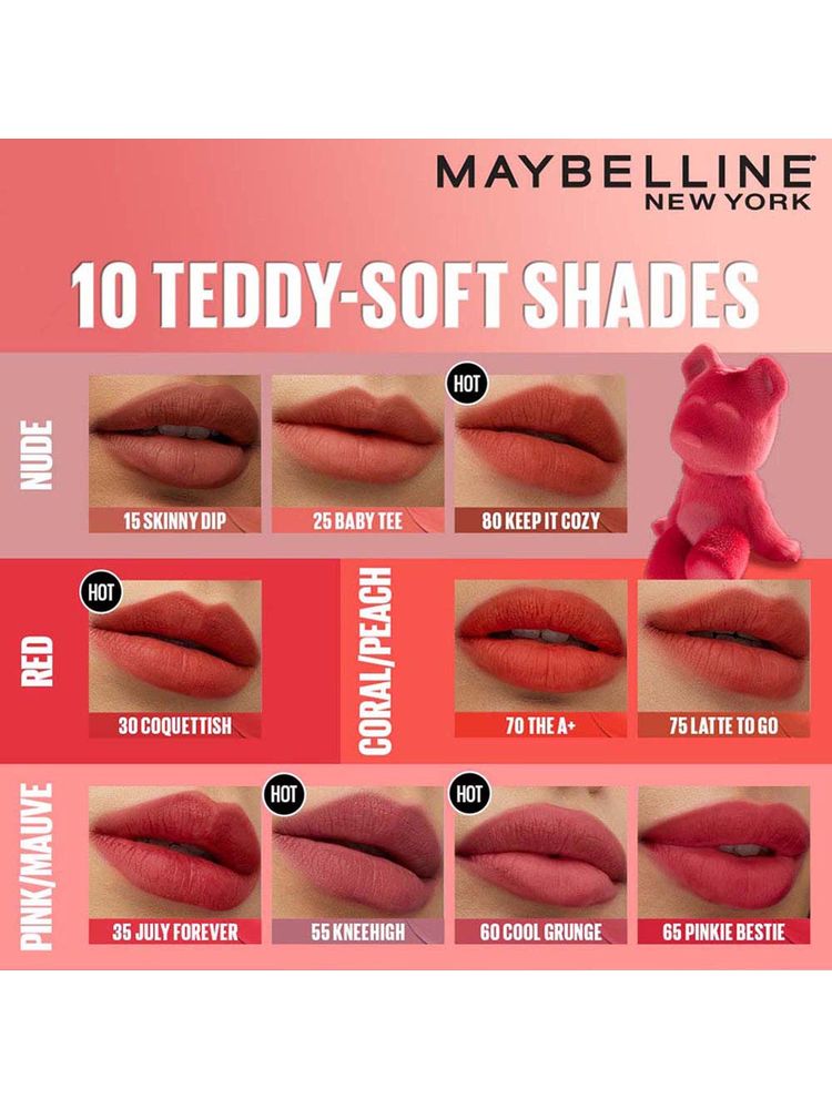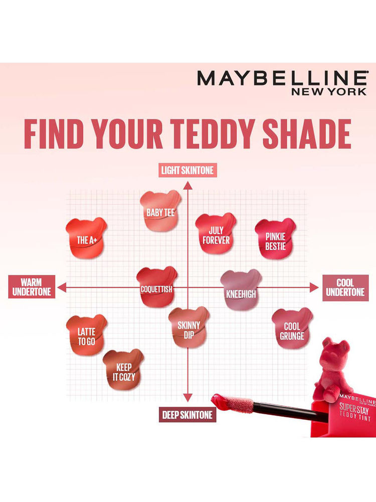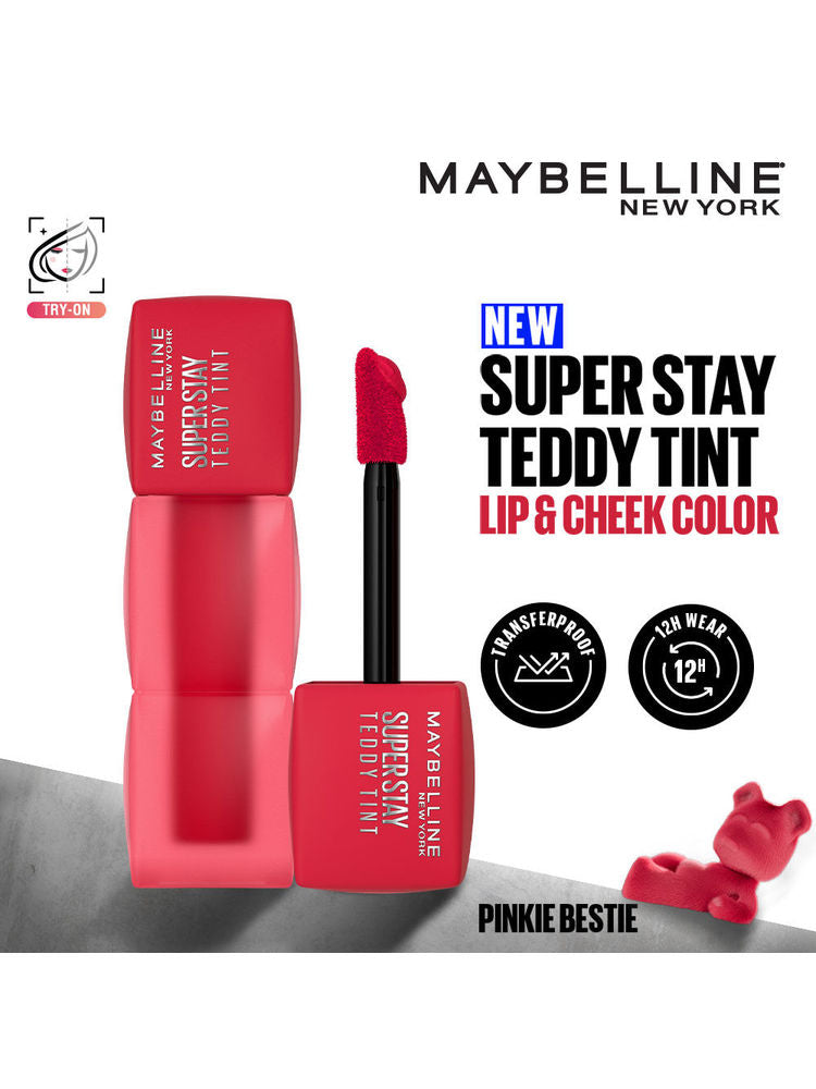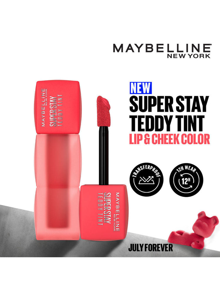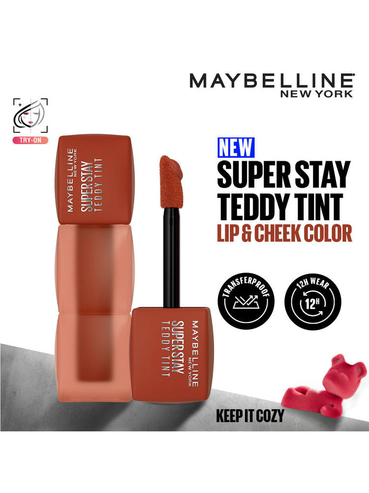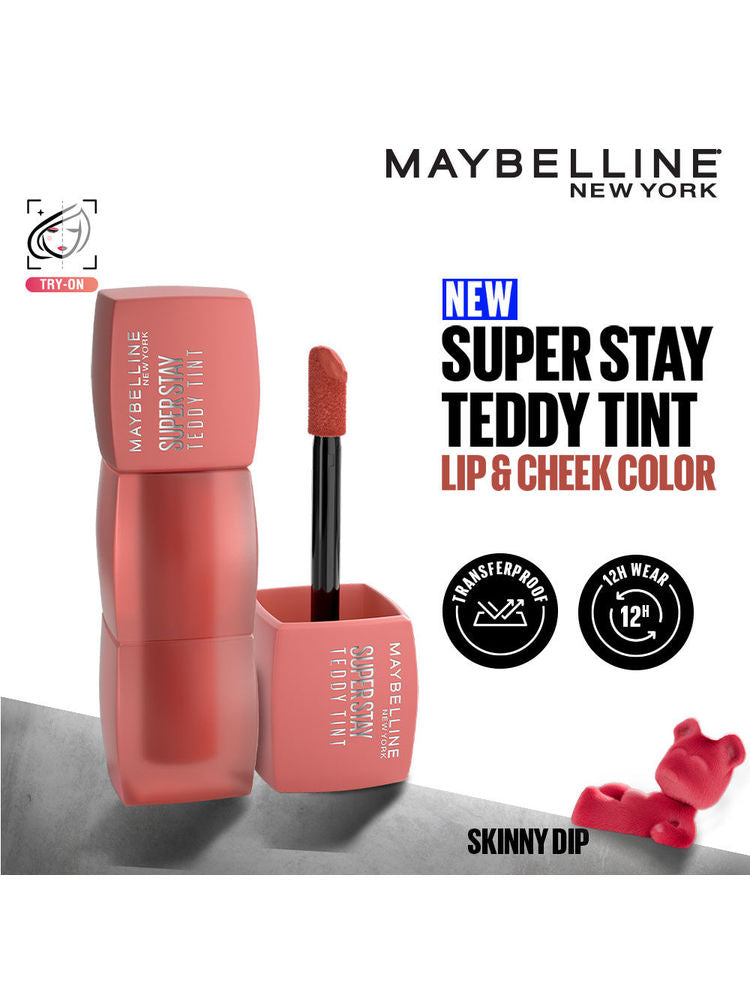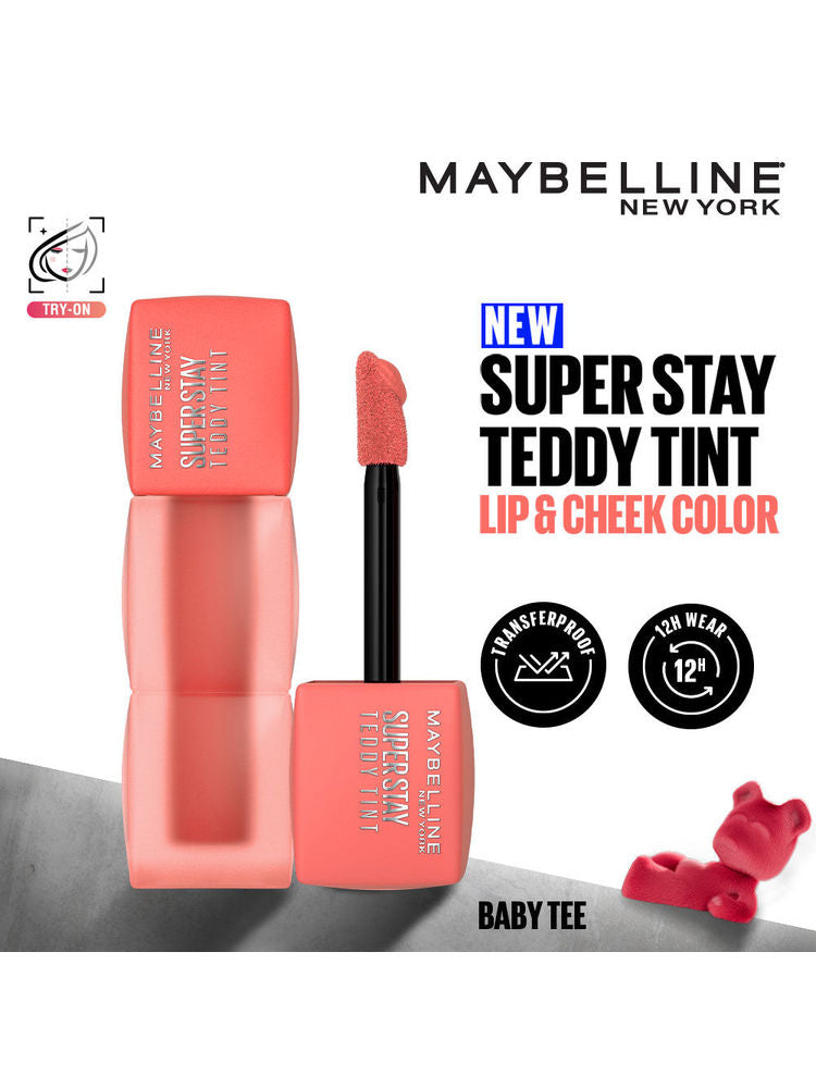 Maybelline New York Superstay Teddy Tint - Lip And Cheek Color - Knee High(5ml) Apply super stay teddy tint to clean dry lips.Build more color as per your desired look.Dab on cheeks and blend with fingers or brush.Let it dry. delivers intense pigment with a striking vinyl shine that lasts up to 16 hours. Designed for bold beauty lovers, this liquid lipstick stays put without smudging or fading throughout the day. The lightweight, no-budge formula keeps lips hydrated and vibrant from morning to night.