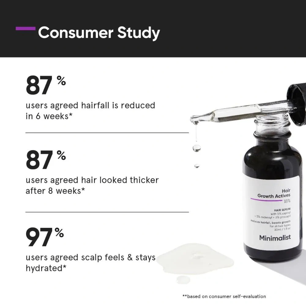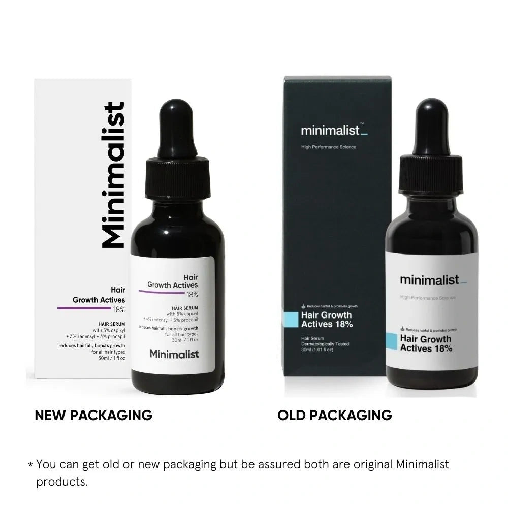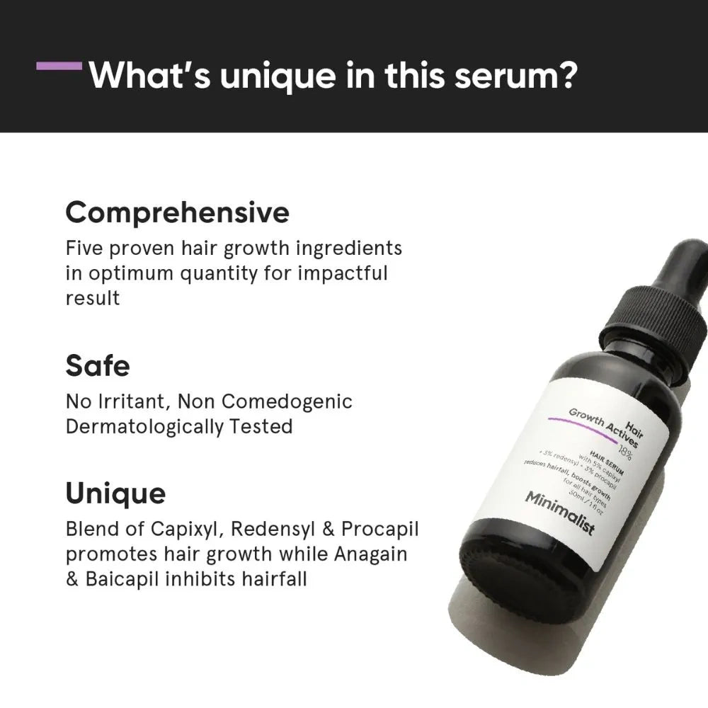 Minimalist 18% Hair Growth Actives Hair Growth Serum is formulated with a potent blend of Procapil, Capixyl, Redensyl, Anagain, and Baicapil to target hair fall effectively. This expert-grade serum supports hair follicle strength, stimulates new growth, and improves scalp health, helping reduce thinning and promote denser, healthier hair. Suitable for daily use, it offers a scientifically backed approach to hair rejuvenation.