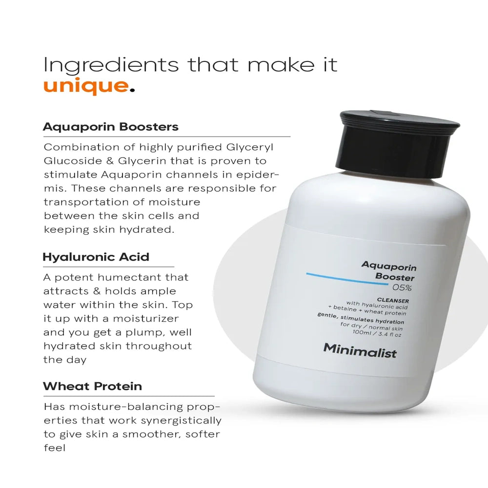 This minimalist 5% Aquaporin Booster Cleanser combines gentle cleansing with targeted hydration. Enriched with hyaluronic acid, it effectively removes impurities while boosting the skin’s moisture retention by activating aquaporin channels. Suitable for all skin types, this 100 ml face wash maintains the skin’s natural balance without stripping essential oils, leaving a refreshed and hydrated complexion. An expert choice for daily use, it supports skin barrier health and promotes a plump, smooth texture.