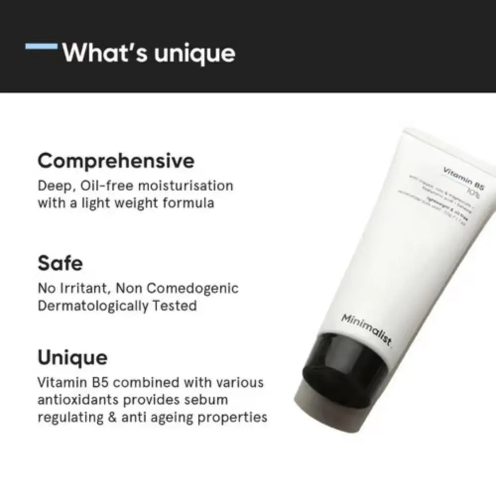 Minimalist Vitamin B5 10% Moisturize (30gm) is a concentrated hydrating formula designed to enhance skin barrier function and improve moisture retention. With 10% vitamin B5, it supports skin repair and soothes irritation, leaving the skin feeling soft and resilient. This lightweight moisturizer is suitable for daily use, promoting balanced hydration without heaviness or greasiness. Ideal for those seeking expert-level skin nourishment and protection.