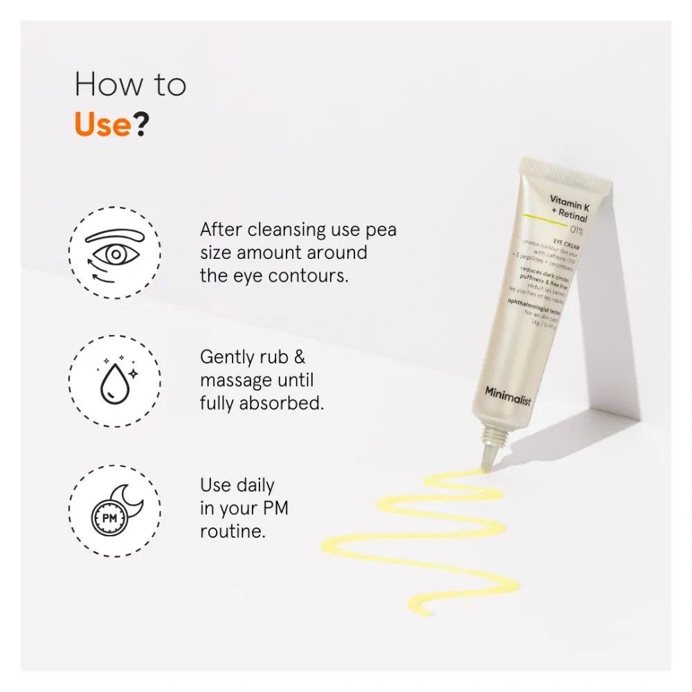 Minimalist Vitamin K + Retinal 01% Eye Cream combines the brightening power of Vitamin K with the gentle yet effective action of 0.1% Retinal to target under-eye dark circles and puffiness. This 14 gm formula supports skin renewal and improves circulation, helping to reduce discoloration and swelling around the eyes. Its lightweight texture absorbs quickly, making it suitable for daily use while promoting a refreshed and more youthful appearance.
