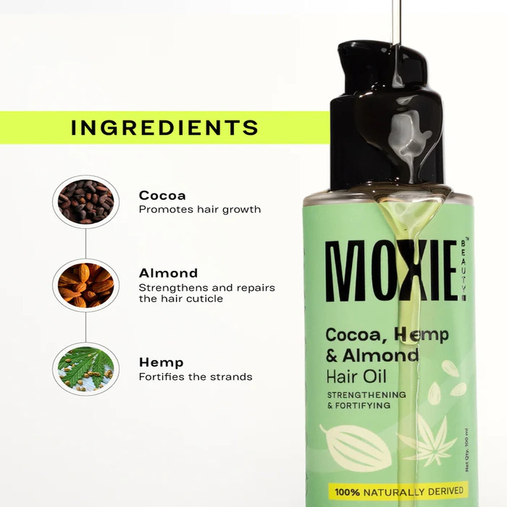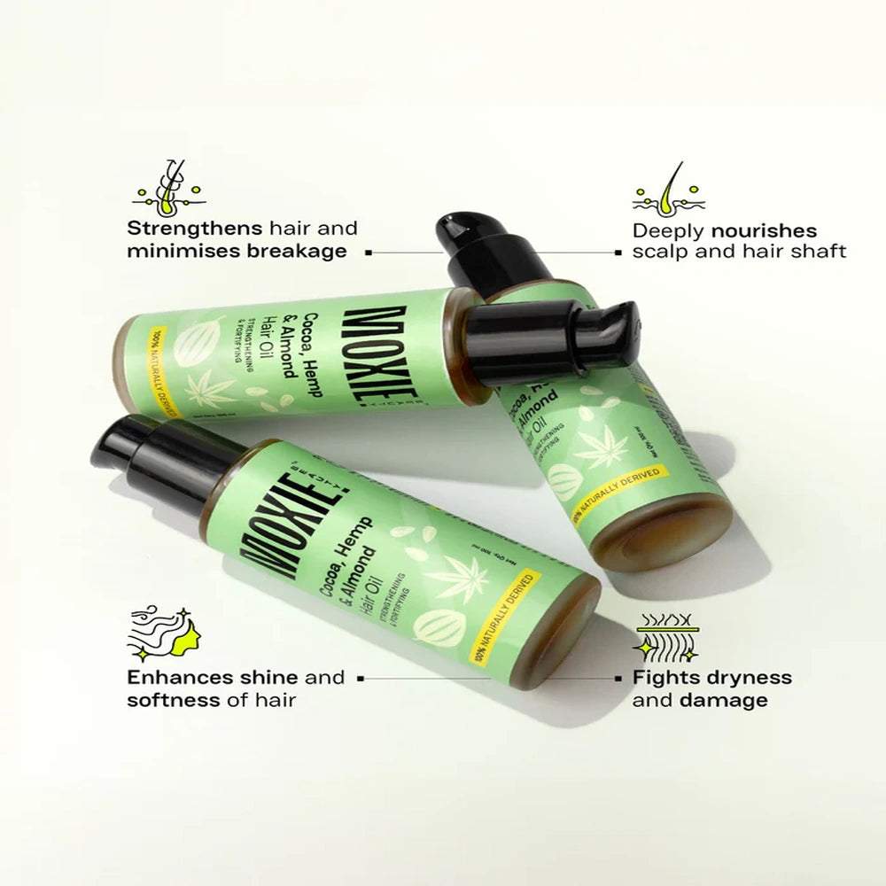 Moxie Beauty Cocoa Hemp & Almond Hair Oil blends nourishing cocoa, hemp, and almond oils to deeply hydrate and strengthen hair. This expert formulation helps reduce breakage and split ends while promoting natural shine and softness. Ideal for all hair types, it supports scalp health and smooths frizz, leaving hair manageable and revitalized with each use.