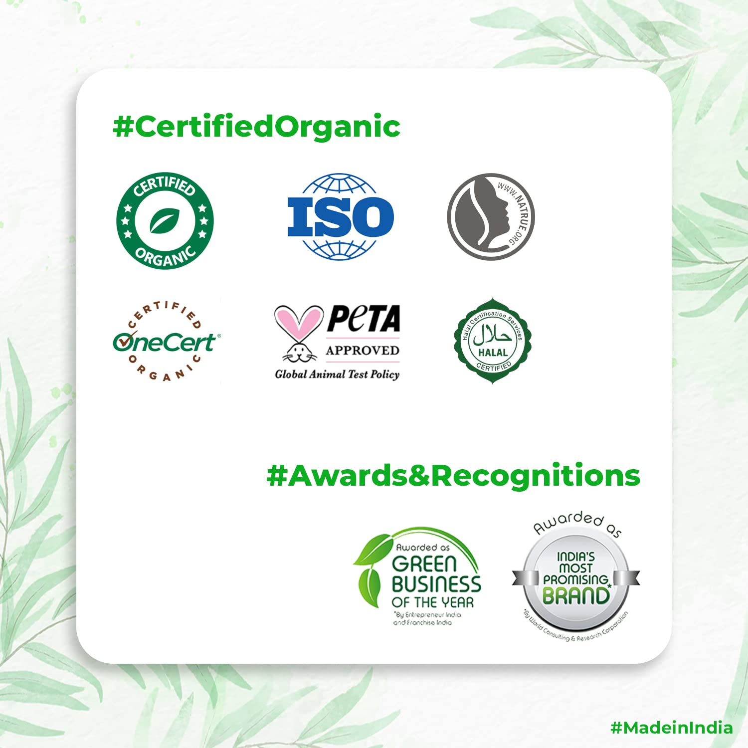 KEY INGREDIENTS: Organic Neem Extract due to its anti-bacterial and anti-fungal properties help in reducing acne and blemishes. It also helps in restoring moisture, enhancing elasticity, stimulating collagen production and nourishing dry skin.