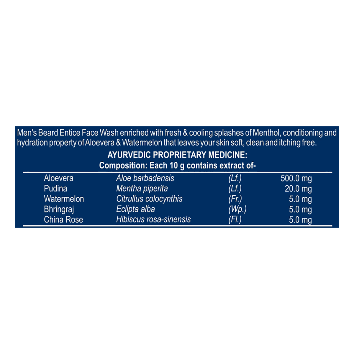 Patanjali Men's Beard Entice Face Wash condition, soothe, and refresh your beard and face to achieve an alluring appearance. This gentle cleanser effectively purifies the beard, leaving it conditioned, itch-free, and the skin feeling smooth and revitalized. Its enticing formula is enriched with beneficial natural ingredients such as Aloe Vera (Aloe Barbadensis), Pudina, Watermelon, Bhringraj, and China Rose.