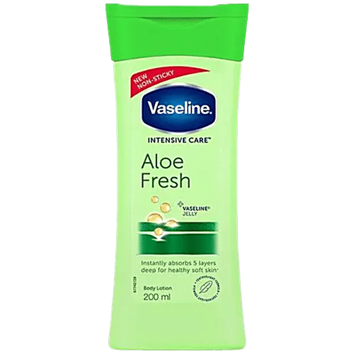 Vaseline Intensive Care Aloe Fresh – Non sticky lotion, Feather light formula with 100% pure aloe vera extracts & microdroplets of Vaseline jelly, restores skin’s moisture to give soft & healthy skin. It’s a advanced formulated light non sticky lotion to give you a featherlight feel & instantly absorbs 5 layer deep for healthy soft skin. Aloe vera has long been used as a home ready to deal with dry flaky skin. It’s believed to have soothing properties to restore smooth supple skin and is effective at improving skin hydration. Aloe vera is an effective skin-conditioning which calms the skin and leaves it feeling deeply moisturized. ven Vaseline Jelly creates an extra layer of protection, preventing moisture from escaping and helping aid your skin’s natural recovery process. Vaseline Intensive Care Aloe Fresh lotion helps rejuvenates & moisturises skin even in summers with its non sticky formula. It is a light lotion, that instantly absorbs 5 layers deep for a non-greasy & non-sticky feel – to keep your skin soft & healthy.