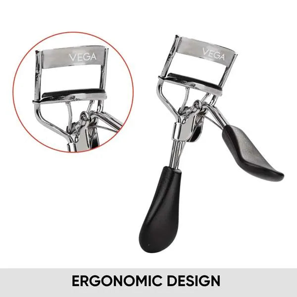 Vega Premium Eyelash Curler is a high-quality eyelash curler to get the desired curls at home. It features comfortable rubber pad handles and a half-rounded curling pad with a smooth opening and closing action, making it easy to use by anyone. The ergonomic design of the eye lash curler provides easy grip and precision curling, to create beautiful curls for parties, work and more in just a few seconds.