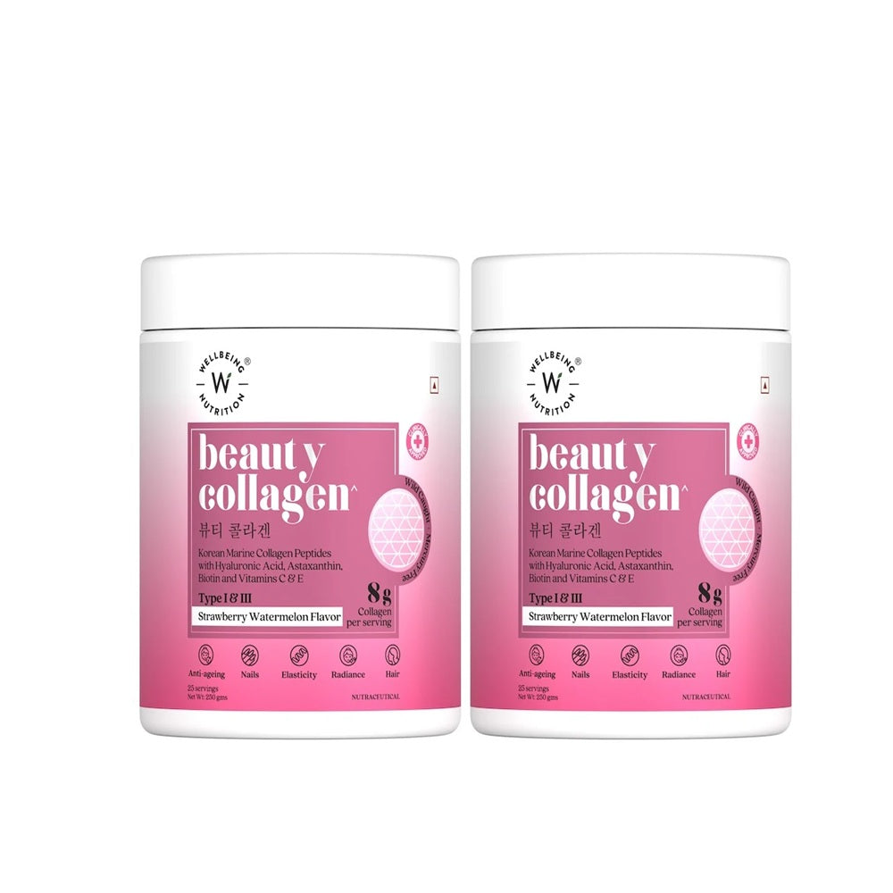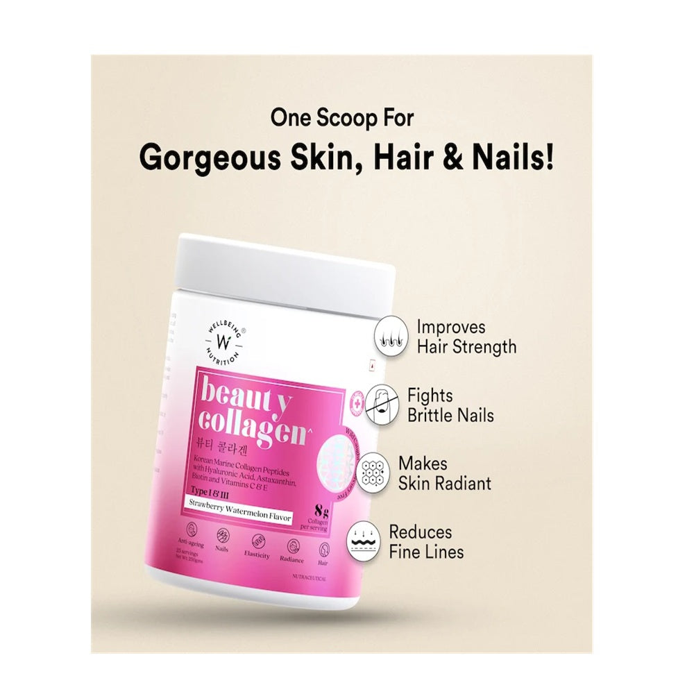 Wellbeing Nutrition Beauty Collagen in Strawberry Watermelon Flavor combines essential collagen peptides with a refreshing taste to support skin elasticity, hydration, and overall beauty from within. This advanced formula is designed to promote healthier hair, nails, and youthful skin by replenishing collagen levels that diminish with age. Ideal for anyone seeking expert-backed nutritional support to maintain a radiant and revitalized appearance.